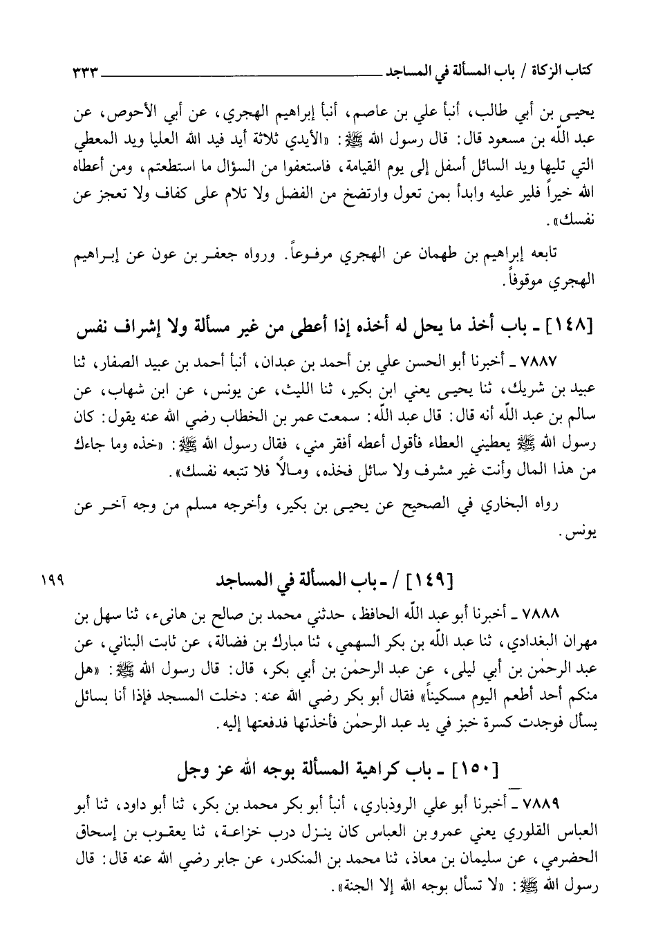 7889 - أَخْبَرَنَا أَبُو عَلِيٍّ الرُّوذْبَارِيُّ، أنبأ أَبُو بَكْرٍ مُحَمَّدُ بْنُ بَكْرٍ، ثنا أَبُو دَاوُدَ، ثنا أَبُو الْعَبَّاسِ الْقِلَّوْرِيُّ يَعْنِي عَمْرَو بْنَ الْعَبَّاسِ، كَانَ يَنْزِلُ دَرْبَ خُزَاعَةَ، ثنا يَعْقُوبُ بْنُ إِسْحَاقَ الْحَضْرَمِيُّ، عَنْ سُلَيْمَانَ بْنِ مُعَاذٍ، ثنا مُحَمَّدُ بْنُ الْمُنْكَدِرِ، عَنْ جَابِرٍ رَضِيَ اللهُ عَنْهُ قَالَ: قَالَ رَسُولُ اللهِ صَلَّى اللهُ عَلَيْهِ وَسَلَّمَ: §" لَا تَسْأَلْ بِوَجْهِ اللهِ إِلَّا الْجَنَّةَ "