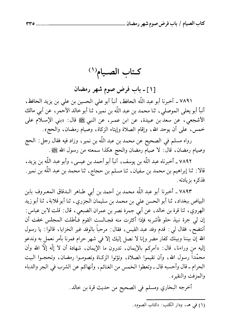 7891 - أَخْبَرَنَا أَبُو عَبْدِ اللهِ الْحَافِظُ، أنبأ أَبُو عَلِيٍّ الْحُسَيْنُ بْنُ عَلِيِّ بْنِ يَزِيدَ الْحَافِظُ، أنبأ أَبُو يَعْلَى الْمَوْصِلِيُّ، ثنا مُحَمَّدُ بْنُ عَبْدِ اللهِ بْنِ نُمَيْرٍ، ثنا أَبُو خَالِدٍ الْأَحْمَرُ، عَنْ أَبِي مَالِكٍ الْأَشْجَعِيِّ، عَنْ سَعْدِ بْنِ عُبَيْدَةَ، عَنِ ابْنِ عُمَرَ، عَنِ النَّبِيِّ صَلَّى اللهُ عَلَيْهِ وَسَلَّمَ قَالَ: " §بُنِيَ الْإِسْلَامُ عَلَى خَمْسٍ، عَلَى أَنْ يُوَحَّدَ اللهُ، وَإِقَامِ الصَّلَاةِ وَإِيتَاءِ الزَّكَاةِ، وَصِيَامِ رَمَضَانَ، وَالْحَجِّ " رَوَاهُ مُسْلِمٌ فِي الصَّحِيحِ عَنْ مُحَمَّدِ بْنِ عَبْدِ اللهِ بْنِ نُمَيْرٍ، وَزَادَ فِيهِ، فَقَالَ رَجُلٌ: الْحَجُّ وَصِيَامُ رَمَضَانَ، قَالَ: لَا، " صِيَامُ رَمَضَانَ وَالْحَجُّ " هَكَذَا سَمِعْتُهُ مِنْ رَسُولِ اللهِ صَلَّى اللهُ عَلَيْهِ وَسَلَّمَ