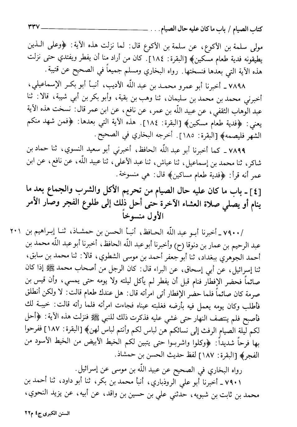 7898 - أَخْبَرَنَا أَبُو عَمْرٍو مُحَمَّدُ بْنُ عَبْدِ اللهِ الْأَدِيبُ أنبأ أَبُو بَكْرٍ الْإِسْمَاعِيلِيُّ، أَخْبَرَنِي مُحَمَّدُ بْنُ مُحَمَّدِ بْنِ سُلَيْمَانَ، ثنا وَهْبُ بْنُ بَقِيَّةَ، وَأَبُو بَكْرِ بْنُ أَبِي شَيْبَةَ، قَالَا: ثنا عَبْدُ الْوَهَّابِ الثَّقَفِيُّ، عَنْ عُبَيْدِ اللهِ بْنِ عُمَرَ، عَنْ نَافِعٍ، عَنِ ابْنِ عُمَرَ، قَالَ: " §نَسَخَتْ هَذِهِ الْآيَةَ يَعْنِي {فِدْيَةٌ طَعَامُ مِسْكِينٍ} [البقرة: 184] هَذِهِ الْآيَةُ الَّتِي بَعْدَهَا {فَمَنْ شَهِدَ مِنْكُمُ الشَّهْرَ فَلْيَصُمْهُ} [البقرة: 185] " أَخْرَجَهُ الْبُخَارِيُّ فِي الصَّحِيحِ