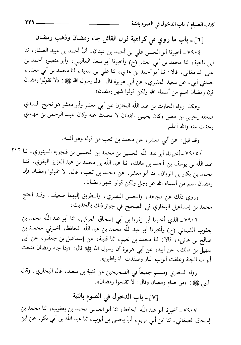 7905 - أَخْبَرَنَاهُ أَبُو عَبْدِ اللهِ الْحُسَيْنُ بْنُ مُحَمَّدِ بْنِ الْحُسَيْنِ بْنِ فِنْجَوَيْهِ الدَّيْنَوَرِيُّ، ثنا عَبْدُ اللهِ بْنُ يُوسُفَ بْنِ أَحْمَدَ بْنِ مَالِكٍ، ثنا عَبْدُ اللهِ بْنُ مُحَمَّدِ بْنِ عَبْدِ الْعَزِيزِ الْبَغَوِيُّ، ثنا مُحَمَّدُ بْنُ بَكَّارِ بْنِ الرَّيَّانِ، ثنا أَبُو مَعْشَرٍ، عَنْ مُحَمَّدِ بْنِ كَعْبٍ، قَالَ: §" لَا تَقُولُوا رَمَضَانُ فَإِنَّ رَمَضَانَ اسْمٌ مِنْ أَسْمَاءِ اللهِ عَزَّ وَجَلَّ، وَلَكِنْ قُولُوا: شَهْرُ رَمَضَانَ " وَرُوِيَ ذَلِكَ عَنْ مُجَاهِدٍ وَالْحَسَنِ الْبَصْرِيِّ، وَالطَّرِيقُ إِلَيْهِمَا ضَعِيفٌ، وَقَدِ احْتَجَّ مُحَمَّدُ بْنُ إِسْمَاعِيلَ الْبُخَارِيُّ فِي الصَّحِيحِ فِي جَوَازِ ذَلِكَ بِالْحَدِيثِ