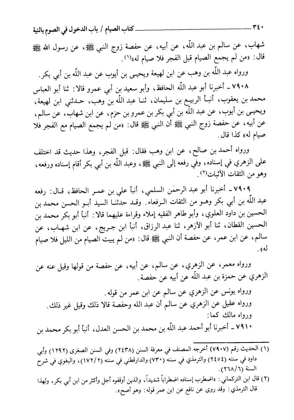 7909 - وَقَدْ حَدَّثَنَا السَّيِّدُ أَبُو الْحَسَنِ مُحَمَّدُ بْنُ الْحُسَيْنِ بْنِ دَاوُدَ الْعَلَوِيُّ، وَأَبُو طَاهِرٍ الْفَقِيهُ إِمْلَاءً وَقِرَاءَةً عَلَيْهِمَا، قَالَا: أنبأ أَبُو بَكْرٍ مُحَمَّدُ بْنُ الْحُسَيْنِ الْقَطَّانُ، ثنا أَبُو الْأَزْهَرِ، ثنا عَبْدُ الرَّزَّاقِ، أنبأ ابْنُ جُرَيْجٍ، عَنِ ابْنِ شِهَابٍ، عَنْ سَالِمٍ، عَنِ ابْنِ عُمَرَ، عَنْ حَفْصَةَ، أَنَّ النَّبِيَّ صَلَّى اللهُ عَلَيْهِ وَسَلَّمَ قَالَ: " §مَنْ لَمْ يُبَيِّتِ الصِّيَامَ مِنَ اللَّيْلِ، فَلَا صِيَامَ لَهُ " وَرَوَاهُ مَعْمَرٌ عَنِ الزُّهْرِيِّ عَنْ سَالِمٍ عَنْ أَبِيهِ، عَنْ حَفْصَةَ مِنْ قَوْلِهَا، وَقِيلَ عَنْهُ عَنِ الزُّهْرِيِّ عَنْ حَمْزَةَ بْنِ عَبْدِ اللهِ عَنْ أَبِيهِ، عَنْ حَفْصَةَ، وَرَوَاهُ يُونُسُ عَنِ الزُّهْرِيِّ عَنْ سَالِمٍ عَنِ ابْنِ عُمَرَ مِنْ قَوْلِهِ، وَرَوَاهُ عَقِيلٌ عَنِ الزُّهْرِيِّ عَنْ سَالِمٍ أَنَّ عَبْدَ اللهِ، وَحَفْصَةَ قَالَا ذَلِكَ، وَقِيلَ غَيْرُ ذَلِكَ، وَرَوَاهُ مَالِكٌ كَمَا: