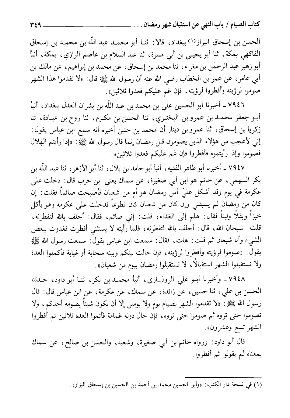 7948 - وَأَخْبَرَنَا أَبُو عَلِيٍّ الرُّوذْبَارِيُّ، أنبأ مُحَمَّدُ بْنُ بَكْرٍ، ثنا أَبُو دَاوُدَ، حَدَّثَنَا الْحَسَنُ بْنُ عَلِيٍّ، ثنا حُسَيْنٌ، عَنْ زَائِدَةَ، عَنْ سِمَاكٍ، عَنْ عِكْرِمَةَ، عَنِ ابْنِ عَبَّاسٍ، قَالَ: قَالَ رَسُولُ اللهِ صَلَّى اللهُ عَلَيْهِ وَسَلَّمَ: " §لَا تَقَدَّمُوا الشَّهْرَ بِصِيَامِ يَوْمٍ وَلَا يَوْمَيْنِ، إِلَّا أَنْ يَكُونَ شَيْئًا يَصُومُهُ أَحَدُكُمْ، وَلَا تَصُومُوا حَتَّى تَرَوْهُ، ثُمَّ صُومُوا حَتَّى تَرَوْهُ، فَإِنْ حَالَ دُونَهُ غَمَامَةٌ فَأَتِمُّوا الْعِدَّةَ ثَلَاثِينَ، ثُمَّ أَفْطِرُوا الشَّهْرُ تِسْعٌ وَعِشْرُونَ "، قَالَ أَبُو دَاوُدَ: وَرَوَاهُ حَاتِمُ بْنُ أَبِي صَغِيرَةَ، وَشُعْبَةُ، وَالْحَسَنُ بْنُ صَالِحٍ عَنْ سِمَاكٍ بِمَعْنَاهُ، لَمْ يَقُولُوا: ثُمَّ أَفْطِرُوا -[350]- قَالَ الشَّيْخُ: وَرَوَاهُ أَبُو عَوَانَةَ عَنْ سِمَاكٍ مُخْتَصَرًا، فَجَعَلَ إِكْمَالَ الْعِدَّةِ لِشَعْبَانَ