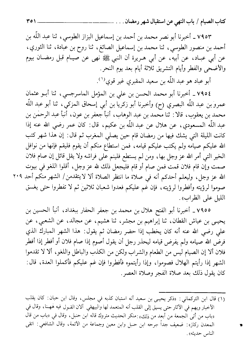 7953 - أَخْبَرَنَا أَبُو نَصْرٍ مُحَمَّدُ بْنُ أَحْمَدَ بْنِ إِسْمَاعِيلَ الْبَزَّازُ الطُّوسِيُّ، ثنا عَبْدُ اللهِ بْنُ أَحْمَدَ بْنِ مَنْصُورٍ الطُّوسِيُّ، ثنا مُحَمَّدُ بْنُ إِسْمَاعِيلَ الصَّائِغُ، ثنا رَوْحُ بْنُ عُبَادَةَ، ثنا الثَّوْرِيُّ، عَنْ أَبِي عَبَّادٍ، عَنْ أَبِيهِ، عَنْ أَبِي هُرَيْرَةَ: " أَنَّ النَّبِيَّ صَلَّى اللهُ عَلَيْهِ وَسَلَّمَ §نَهَى عَنِ الصِّيَامِ قَبْلَ رَمَضَانَ بِيَوْمٍ، وَالْأَضْحَى، وَالْفِطْرِ، وَأَيَّامِ التَّشْرِيقِ ثَلَاثَةِ أَيَّامٍ بَعْدَ يَوْمِ النَّحْرِ " أَبُو عَبَّادٍ هُوَ عَبْدُ اللهِ بْنُ سَعِيدٍ الْمَقْبُرِيُّ غَيْرُ قَوِيٍّ