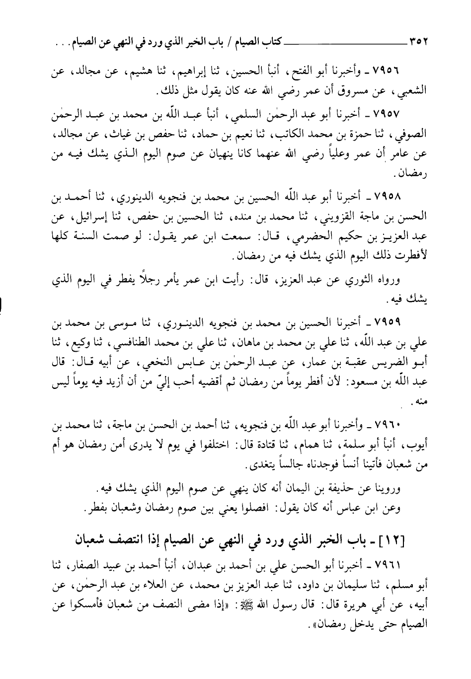 7957 - أَخْبَرَنَا أَبُو عَبْدِ الرَّحْمَنِ السُّلَمِيُّ، أنبأ عَبْدُ اللهِ بْنُ مُحَمَّدِ بْنِ عَبْدِ الرَّحْمَنِ الصُّوفِيُّ، ثنا حَمْزَةُ بْنُ مُحَمَّدٍ الْكَاتِبُ، ثنا نُعَيْمُ بْنُ حَمَّادٍ، ثنا حَفْصُ بْنُ غِيَاثٍ، عَنْ مُجَالِدٍ، عَنْ عَامِرٍ، أَنَّ عُمَرَ، وَعَلِيًّا رَضِيَ اللهُ عَنْهُمَا كَانَا §يَنْهَيَانِ عَنْ صَوْمِ الْيَوْمِ الَّذِي يُشَكُّ فِيهِ مِنْ رَمَضَانَ