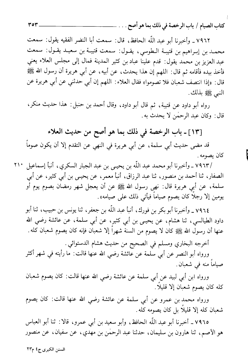 7962 - وَأَخْبَرَنَا أَبُو عَبْدِ اللهِ الْحَافِظُ، قَالَ: سَمِعْتُ أَبَا النَّضْرِ الْفَقِيهَ، يَقُولُ: سَمِعْتُ مُحَمَّدَ بْنَ إِبْرَاهِيمَ بْنِ قُتَيْبَةَ الطُّوسِيَّ، يَقُولُ: سَمِعْتُ قُتَيْبَةَ بْنَ سَعِيدٍ، يَقُولُ: سمعت عَبْدَ الْعَزِيزِ بْنَ مُحَمَّدٍ، يَقُولُ: قَدِمَ عَلَيْنَا عَبَّادُ بْنُ كَثِيرٍ الْمَدِينَةَ، فَمَالَ إِلَى مَجْلِسِ الْعَلَاءِ يَعْنِي فَأَخَذَ بِيَدِهِ فَأَقَامَهُ ثُمَّ قَالَ: اللهُمَّ إِنَّ هَذَا يُحَدِّثُ عَنْ أَبِيهِ، عَنْ أَبِي هُرَيْرَةَ أَنَّ رَسُولَ اللهِ صَلَّى اللهُ عَلَيْهِ وَسَلَّمَ قَالَ: §" إِذَا انْتَصَفَ شَعْبَانُ فَلَا تَصُومُوا ". فَقَالَ الْعَلَاءُ " اللهُمَّ إِنَّ أَبِي حَدَّثَنِي عَنْ أَبِي هُرَيْرَةَ عَنِ النَّبِيِّ صَلَّى اللهُ عَلَيْهِ وَسَلَّمَ بِذَلِكَ. رَوَاهُ أَبُو دَاوُدَ عَنْ قُتَيْبَةَ، ثُمَّ قَالَ أَبُو دَاوُدَ: وَقَالَ أَحْمَدُ بْنُ حَنْبَلٍ: هَذَا حَدِيثٌ مُنْكَرٌ، قَالَ: وَكَانَ عَبْدُ الرَّحْمَنِ لَا يُحَدِّثُ بِهِ