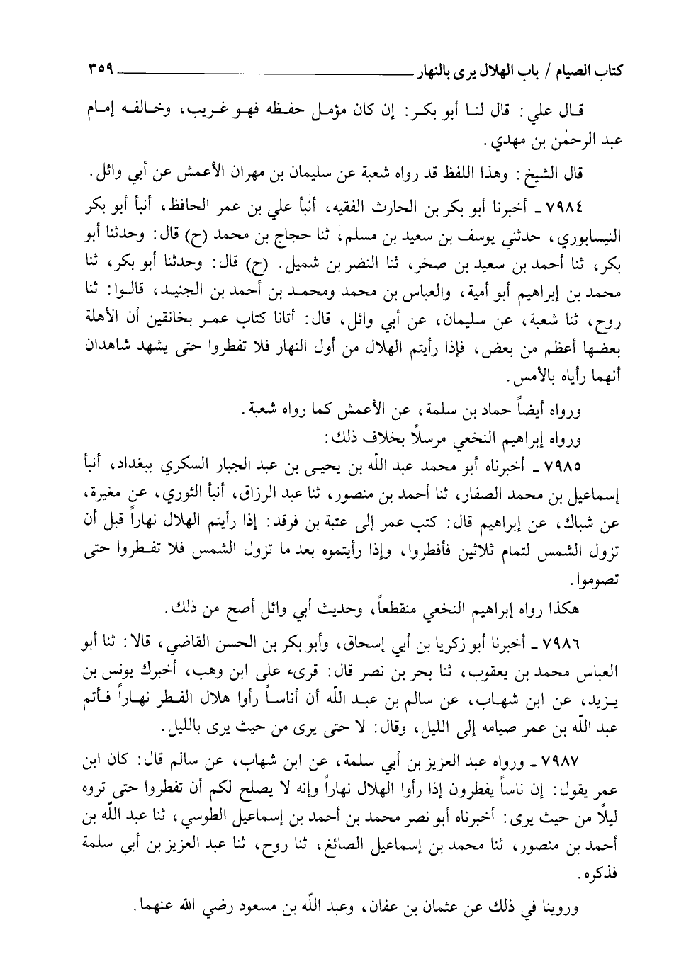 7984 - أَخْبَرَنَا أَبُو بَكْرِ بْنُ الْحَارِثِ الْفَقِيهُ، أنبأ عَلِيُّ بْنُ عُمَرَ الْحَافِظُ، أنبأ أَبُو بَكْرٍ النَّيْسَابُورِيُّ، حَدَّثَنِي يُوسُفُ بْنُ سَعِيدِ بْنِ مُسْلِمٍ، ثنا حَجَّاجُ بْنُ مُحَمَّدٍ، ح قَالَ: وَحَدَّثَنَا أَبُو بَكْرٍ، ثنا أَحْمَدُ بْنُ سَعِيدِ بْنِ صَخْرٍ، ثنا النَّضْرُ بْنُ شُمَيْلٍ، ح قَالَ: وَحَدَّثَنَا أَبُو بَكْرٍ، ثنا مُحَمَّدُ بْنُ إِبْرَاهِيمَ أَبُو أُمَيَّةَ، وَالْعَبَّاسُ بْنُ مُحَمَّدٍ، وَمُحَمَّدُ بْنُ أَحْمَدَ بْنِ الْجُنَيْدِ، قَالُوا: ثنا رَوْحٌ، ثنا شُعْبَةُ، عَنْ سُلَيْمَانَ، عَنْ أَبِي وَائِلٍ، قَالَ: أَتَانَا كِتَابُ عُمَرَ بِخَانِقِينَ: " إِنَّ الْأَهِلَّةَ بَعْضُهَا أَعْظَمُ مِنْ بَعْضٍ , §فَإِذَا رَأَيْتُمُ الْهِلَالَ مِنْ أَوَّلِ النَّهَارِ فَلَا تُفْطِرُوا حَتَّى يَشْهَدَ شَاهِدَانِ أَنَّهُمَا رَأَيَاهُ بِالْأَمْسِ ". وَرَوَاهُ أَيْضًا حَمَّادُ بْنُ سَلَمَةَ عَنِ الْأَعْمَشِ، كَمَا رَوَاهُ شُعْبَةُ وَرَوَاهُ إِبْرَاهِيمُ النَّخَعِيُّ مُرْسَلًا بِخِلَافِ ذَلِكَ