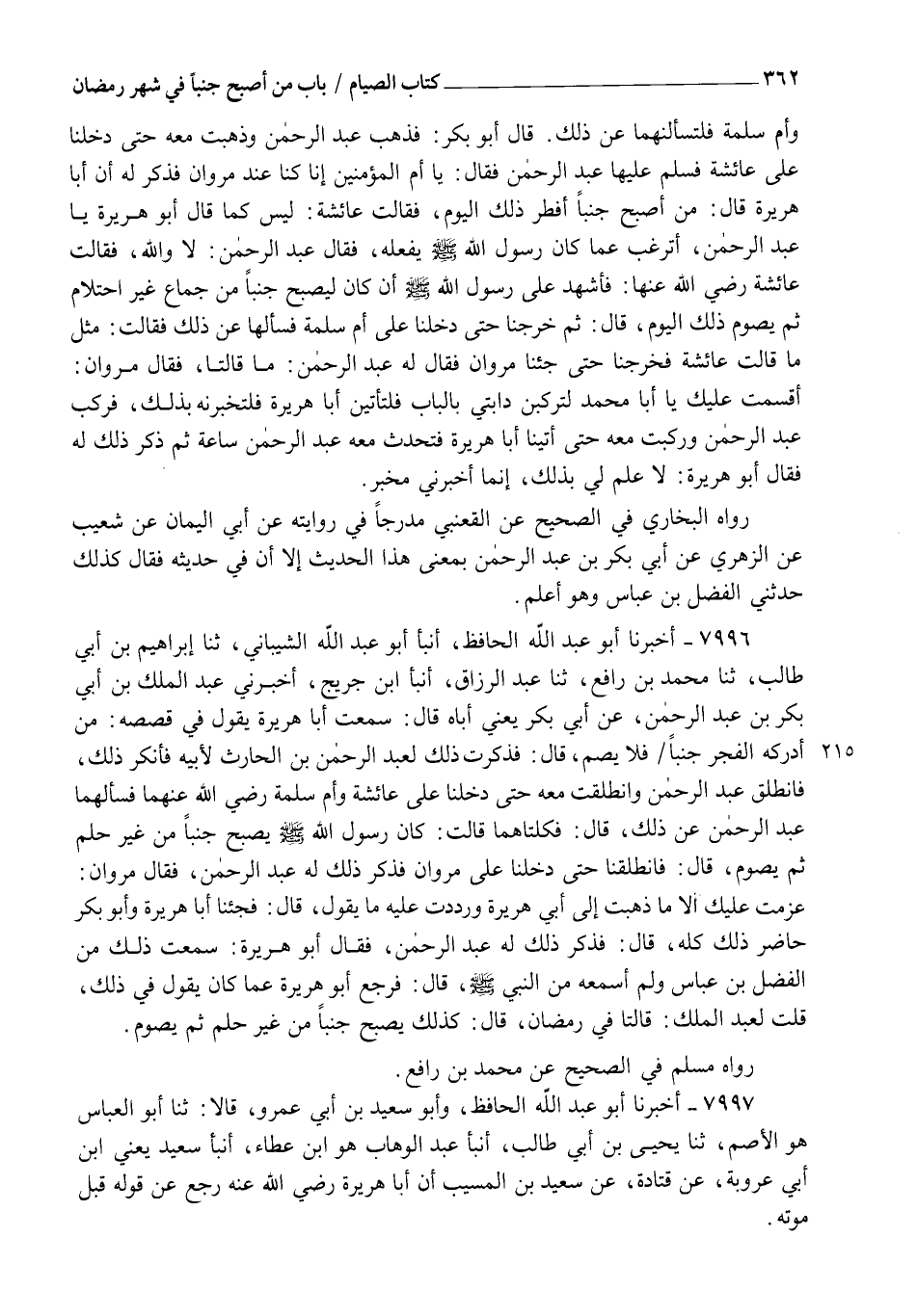 7996 - أَخْبَرَنَا أَبُو عَبْدِ اللهِ الْحَافِظُ، أنبأ أَبُو عَبْدِ اللهِ الشَّيْبَانِيُّ، ثنا إِبْرَاهِيمُ بْنُ أَبِي طَالِبٍ، ثنا مُحَمَّدُ بْنُ رَافِعٍ، ثنا عَبْدُ الرَّزَّاقِ، أنبأ ابْنُ جُرَيْجٍ، أَخْبَرَنِي عَبْدُ الْمَلِكِ بْنُ أَبِي بَكْرِ بْنِ عَبْدِ الرَّحْمَنِ، عَنْ أَبِي بَكْرٍ يَعْنِي أَبَاهُ، قَالَ: سَمِعْتُ أَبَا هُرَيْرَةَ يَقُولُ فِي قَصَصِهِ: مَنْ أَدْرَكَهُ الْفَجْرُ جُنُبًا فَلَا يَصُمْ , قَالَ: فَذَكَرْتُ ذَلِكَ لِعَبْدِ الرَّحْمَنِ بْنِ الْحَارِثِ لِأَبِيهِ، فَأَنْكَرَ ذَلِكَ , فَانْطَلَقَ عَبْدُ الرَّحْمَنِ وَانْطَلَقْتُ مَعَهُ حَتَّى دَخَلْنَا عَلَى عَائِشَةَ وَأُمِّ سَلَمَةَ رَضِيَ اللهُ عَنْهُمَا، فَسَأَلَهُمَا عَبْدُ الرَّحْمَنِ عَنْ ذَلِكَ , قَالَ: فَكِلْتَاهُمَا قَالَتْ: " كَانَ رَسُولُ اللهِ صَلَّى اللهُ عَلَيْهِ وَسَلَّمَ §يُصْبِحُ جُنُبًا مِنْ غَيْرِ حُلْمٍ ثُمَّ يَصُومُ " قَالَ: فَانْطَلَقْنَا حَتَّى دَخَلْنَا عَلَى مَرْوَانَ فَذَكَرَ ذَلِكَ لَهُ عَبْدُ الرَّحْمَنِ فَقَالَ مَرْوَانُ عَزَمْتُ عَلَيْكَ إِلَّا مَا ذَهَبْتَ إِلَى أَبِي هُرَيْرَةَ وَرَدَدْتَ عَلَيْهِ مَا يَقُولُ، قَالَ: فَجِئْنَا أَبَا هُرَيْرَةَ وَأَبُو بَكْرٍ حَاضِرٌ ذَلِكَ كُلَّهُ، قَالَ: فَذَكَرَ ذَلِكَ لَهُ عَبْدُ الرَّحْمَنِ، فَقَالَ أَبُو هُرَيْرَةَ: سَمِعْتُ ذَلِكَ مِنَ الْفَضْلِ بْنِ عَبَّاسٍ وَلَمْ أَسْمَعْهُ مِنَ النَّبِيِّ صَلَّى اللهُ عَلَيْهِ وَسَلَّمَ , قَالَ: فَرَجَعَ أَبُو هُرَيْرَةَ عَمَّا كَانَ يَقُولُ فِي ذَلِكَ، قُلْتُ لِعَبْدِ الْمَلِكِ: قَالَتَا: فِي رَمَضَانَ؟ قَالَ: كَذَلِكَ يُصْبِحُ جُنُبًا مِنْ غَيْرِ حُلْمٍ ثُمَّ يَصُومُ رَوَاهُ مُسْلِمٌ فِي الصَّحِيحِ عَنْ مُحَمَّدِ بْنِ رَافِعٍ