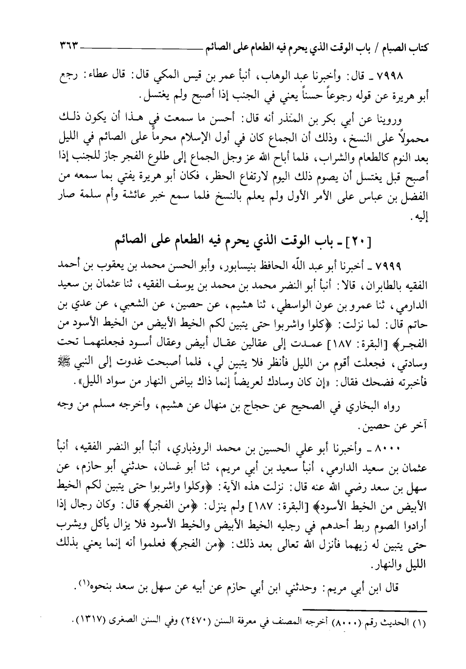 8000 - وَأَخْبَرَنَا أَبُو عَلِيٍّ الْحُسَيْنُ بْنُ مُحَمَّدٍ الرُّوذْبَارِيُّ، أنبأ أَبُو النَّضْرِ الْفَقِيهُ، أنبأ عُثْمَانُ بْنُ سَعِيدٍ الدَّارِمِيُّ، أنبأ سَعِيدُ بْنُ أَبِي مَرْيَمَ، ثنا أَبُو غَسَّانَ، حَدَّثَنِي أَبُو حَازِمٍ، عَنْ سَهْلِ بْنِ سَعْدٍ رَضِيَ اللهُ عَنْهُ قَالَ: " نَزَلَتْ هَذِهِ الْآيَةُ {§وَكُلُوا وَاشْرَبُوا حَتَّى يَتَبَيَّنَ لَكُمُ الْخَيْطُ الْأَبْيَضُ مِنَ الْخَيْطِ الْأَسْوَدِ} [البقرة: 187]، وَلَمْ يَنْزِلْ: {مِنَ الْفَجْرِ} [البقرة: 187] قَالَ: وَكَانَ رِجَالٌ إِذَا أَرَادُوا الصَّوْمَ رَبَطَ أَحَدُهُمْ فِي رِجْلَيْهِ الْخَيْطَ الْأَبْيَضَ وَالْخَيْطَ الْأَسْوَدَ فَلَا يَزَالُ يَأْكُلُ وَيَشْرَبُ حَتَّى يَتَبَيَّنَ لَهُ رُؤْيَتُهُمَا، فَأَنْزَلَ اللهُ تَعَالَى بَعْدَ ذَلِكَ {مِنَ الْفَجْرِ} [البقرة: 187] فَعَلِمُوا أَنَّهُ إِنَّمَا يَعْنِي بِذَلِكَ اللَّيْلَ وَالنَّهَارَ " , قَالَ ابْنُ أَبِي مَرْيَمَ وَحَدَّثَنِي ابْنُ أَبِي حَازِمٍ عَنْ أَبِيهِ عَنْ سَهْلِ بْنِ سَعْدٍ بِنَحْوِهِ. -[364]- رَوَاهُ الْبُخَارِيُّ فِي الصَّحِيحِ عَنْ سَعِيدِ بْنِ أَبِي مَرْيَمَ بِالْإِسْنَادَيْنِ جَمِيعًا. وَرَوَاهُ مُسْلِمٌ عَنْ مُحَمَّدِ بْنِ سَهْلٍ وَأَبِي بَكْرِ بْنِ إِسْحَاقَ، عَنِ ابْنِ أَبِي مَرْيَمَ بِالْإِسْنَادِ الْأَوَّلِ