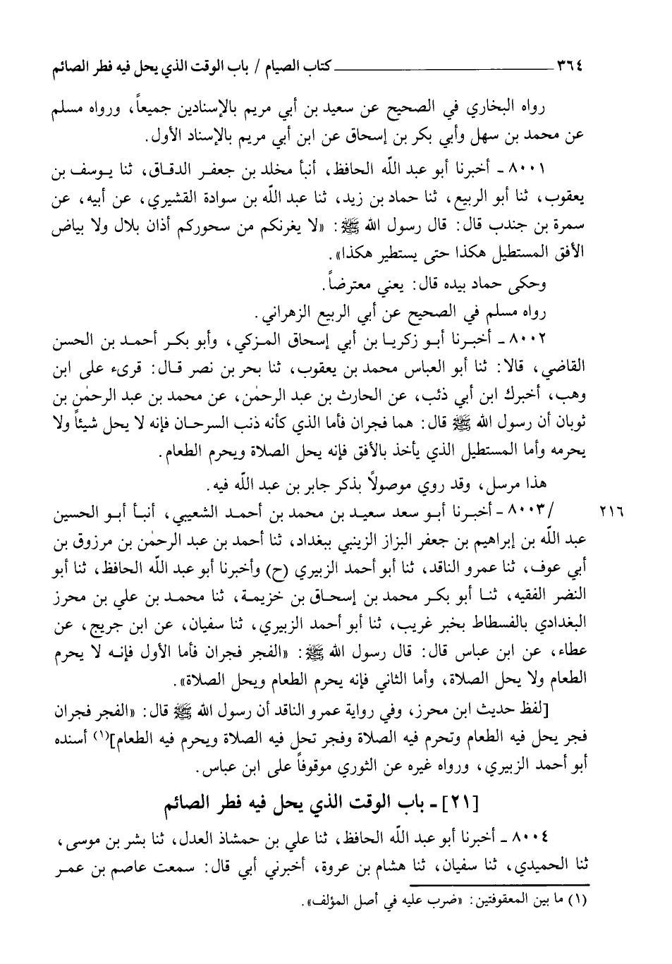 8003 - أَخْبَرَنَا أَبُو سَعْدٍ سَعِيدُ بْنُ مُحَمَّدِ بْنِ أَحْمَدَ الشُّعَيْبِيُّ , أنبأ أَبُو الْحُسَيْنِ عَبْدُ اللهِ بْنُ إِبْرَاهِيمَ بْنِ جَعْفَرٍ الْبَزَّازُ الزَّيْنَبِيُّ بِبَغْدَادَ , ثنا أَحْمَدُ بْنُ عَبْدِ الرَّحْمَنِ بْنِ مَرْزُوقِ بْنِ أَبِي عَوْفٍ، ثنا عَمْرٌو النَّاقِدُ، ثنا أَبُو أَحْمَدَ الزُّبَيْرِيُّ، ح وَأَخْبَرَنَا أَبُو عَبْدِ اللهِ الْحَافِظُ، ثنا أَبُو النَّضْرِ الْفَقِيهُ، ثنا أَبُو بَكْرٍ مُحَمَّدُ بْنُ إِسْحَاقَ بْنِ خُزَيْمَةَ , ثنا مُحَمَّدُ بْنُ عَلِيِّ بْنِ مُحْرِزٍ الْبَغْدَادِيُّ بِالْفُسْطَاطِ بِخَبَرٍ غَرِيبٍ , ثنا أَبُو أَحْمَدَ الزُّبَيْرِيُّ، ثنا سُفْيَانُ، عَنِ ابْنِ جُرَيْجٍ، عَنْ عَطَاءٍ، عَنِ ابْنِ عَبَّاسٍ، قَالَ: قَالَ رَسُولُ اللهِ صَلَّى اللهُ عَلَيْهِ وَسَلَّمَ: " §الْفَجْرُ فَجْرَانِ، فَأَمَّا الْأَوَّلُ فَإِنَّهُ لَا يُحَرِّمُ الطَّعَامَ، وَلَا يُحِلُّ الصَّلَاةَ، وَأَمَّا الثَّانِي فَإِنَّهُ يُحَرِّمُ الطَّعَامَ وَيُحِلُّ الصَّلَاةَ " لَفْظُ حَدِيثِ ابْنِ مُحْرِزٍ، وَفِي رِوَايَةِ عَمْرٍو النَّاقِدِ أَنَّ رَسُولَ اللهِ صَلَّى اللهُ عَلَيْهِ وَسَلَّمَ قَالَ: " الْفَجْرُ فَجْرَانِ: فَجْرٌ يَحِلُّ فِيهِ الطَّعَامُ وَتَحْرُمُ فِيهِ الصَّلَاةُ، وَفَجْرٌ تَحِلُّ فِيهِ الصَّلَاةُ، وَيَحْرُمُ فِيهِ الطَّعَامُ ". أَسْنَدَهُ أَبُو أَحْمَدَ الزُّبَيْرِيُّ وَرَوَاهُ غَيْرُهُ عَنِ الثَّوْرِيِّ مَوْقُوفًا عَلَى ابْنِ عَبَّاسٍ