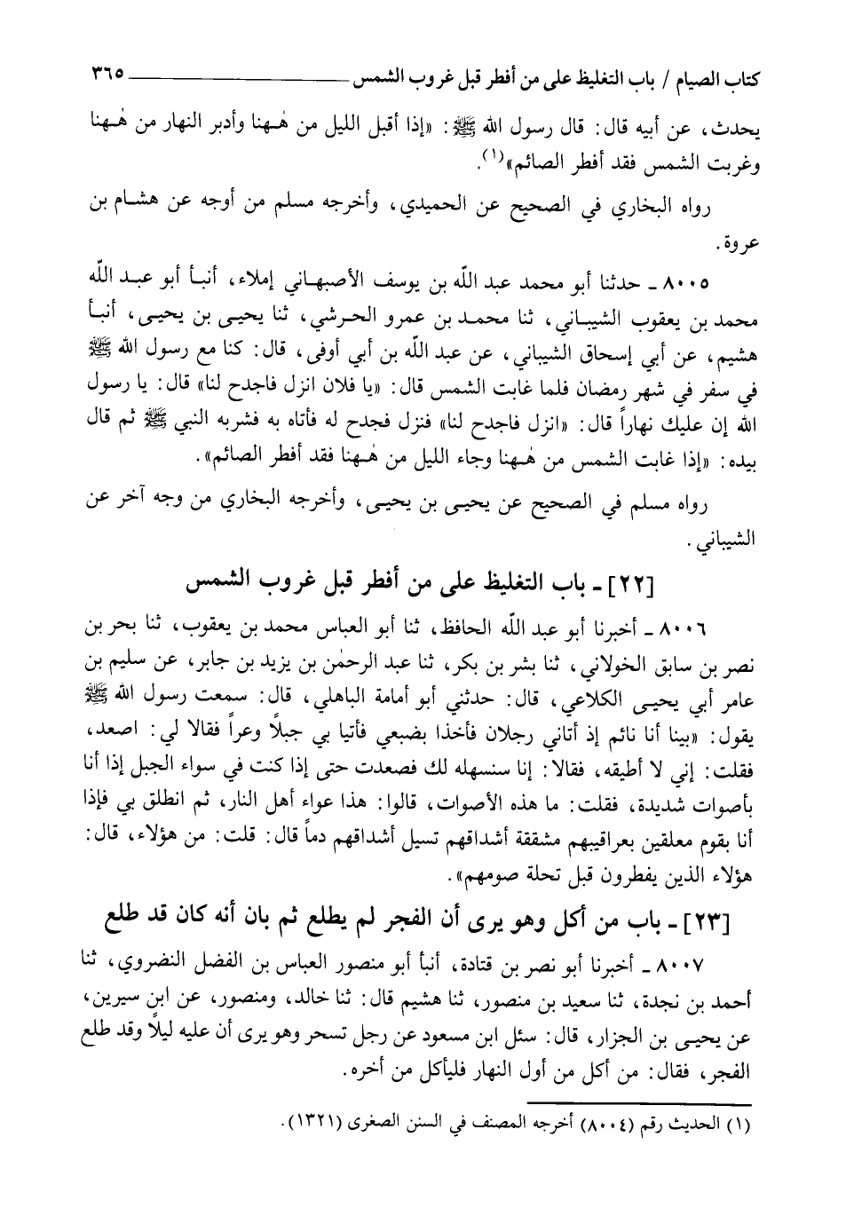 8007 - أَخْبَرَنَا أَبُو نَصْرِ بْنُ قَتَادَةَ، أنبأ أَبُو مَنْصُورٍ الْعَبَّاسُ بْنُ الْفَضْلِ النَّضْرَوِيُّ، ثنا أَحْمَدُ بْنُ نَجْدَةَ، ثنا سَعِيدُ بْنُ مَنْصُورٍ، ثنا هُشَيْمٌ، قَالَ: ثنا خَالِدٌ، وَمَنْصُورٌ، عَنِ ابْنِ سِيرِينَ، عَنْ يَحْيَى بْنِ الْجَزَّارِ، قَالَ: سُئِلَ ابْنُ مَسْعُودٍ عَنْ رَجُلٍ تَسَحَّرَ وَهُوَ يَرَى أَنَّ عَلَيْهِ لَيْلًا وَقَدِ اطَّلَعَ الْفَجْرُ، فَقَالَ: §" مَنْ أَكَلَ مِنْ أَوَّلِ النَّهَارِ فَلْيَأْكُلْ مِنْ آخِرِهِ " -[366]-