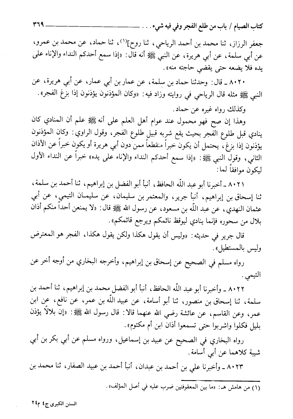 8021 - أَخْبَرَنَا أَبُو عَبْدِ اللهِ الْحَافِظُ، أنبأ أَبُو الْفَضْلِ بْنُ إِبْرَاهِيمَ، ثنا أَحْمَدُ بْنُ سَلَمَةَ، ثنا إِسْحَاقُ بْنُ إِبْرَاهِيمَ، أنبأ جَرِيرٌ، وَالْمُعْتَمِرُ بْنُ سُلَيْمَانَ، عَنْ سُلَيْمَانَ التَّيْمِيِّ، عَنْ أَبِي عُثْمَانَ النَّهْدِيِّ، عَنْ عَبْدِ اللهِ بْنِ مَسْعُودٍ، عَنْ رَسُولِ اللهِ صَلَّى اللهُ عَلَيْهِ وَسَلَّمَ قَالَ: " §لَا يَمْنَعَنَّ أَحَدًا مِنْكُمْ أَذَانُ بِلَالٍ مِنْ سُحُورِهِ، فَإِنَّمَا يُنَادِي لِيُوقِظَ نَائِمَكُمْ، وَيَرْجِعَ قَائِمُكُمْ "، قَالَ جَرِيرٌ فِي حَدِيثِهِ: " وَلَيْسَ أَنْ يَقُولَ هَكَذَا، وَلَكِنْ يَقُولُ: هَكَذَا، الْفَجْرُ هُوَ الْمُعْتَرِضُ وَلَيْسَ بِالْمُسْتَطِيلِ " رَوَاهُ مُسْلِمٌ فِي الصَّحِيحِ عَنْ إِسْحَاقَ بْنِ إِبْرَاهِيمَ، وَأَخْرَجَهُ الْبُخَارِيُّ مِنْ أَوْجُهٍ أُخَرَ عَنِ التَّيْمِيِّ