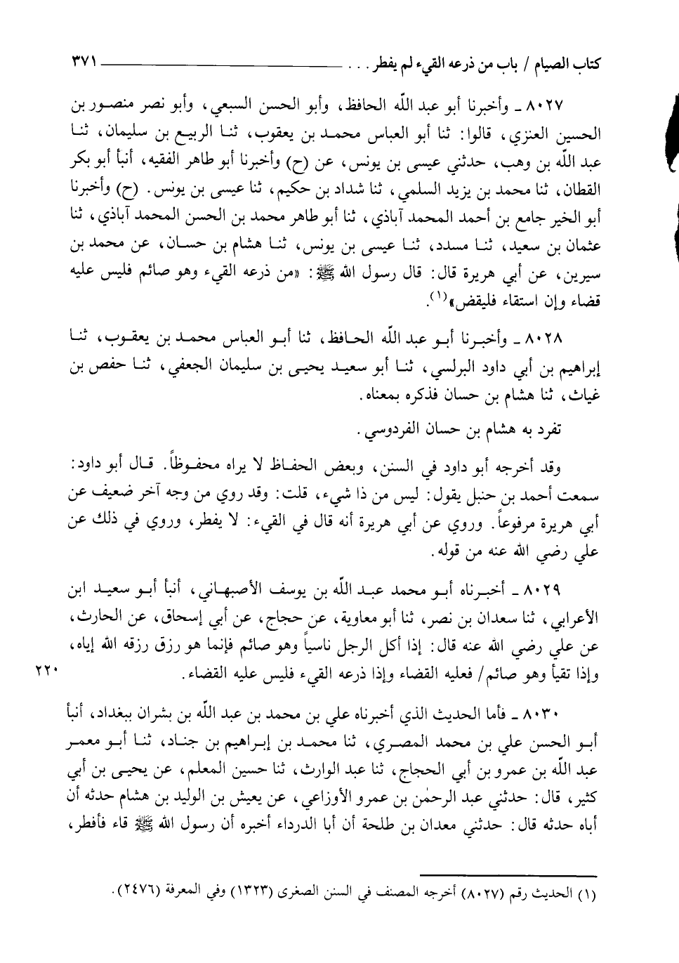 8030 - فَأَمَّا الْحَدِيثُ الَّذِي أَخْبَرَنَاهُ عَلِيُّ بْنُ مُحَمَّدِ بْنِ عَبْدِ اللهِ بْنِ بِشْرَانَ بِبَغْدَادَ، أنبأ أَبُو الْحَسَنِ عَلِيُّ بْنُ مُحَمَّدٍ الْمِصْرِيُّ , ثنا مُحَمَّدُ بْنُ إِبْرَاهِيمَ بْنِ جَنَّادٍ، ثنا أَبُو مَعْمَرٍ عَبْدُ اللهِ بْنُ عُمَرِو بْنِ أَبِي الْحَجَّاجِ، ثنا عَبْدُ الْوَارِثِ، ثنا حُسَيْنٌ الْمُعَلِّمُ، عَنْ يَحْيَى بْنِ أَبِي كَثِيرٍ، قَالَ: حَدَّثَنِي عَبْدُ الرَّحْمَنِ بْنِ عَمْرٍو الْأَوْزَاعِيُّ، عَنْ يَعِيشَ بْنِ الْوَلِيدِ بْنِ هِشَامٍ، حَدَّثَهُ أَنَّ أَبَاهُ حَدَّثَهُ قَالَ: حَدَّثَنِي مَعْدَانُ بْنُ طَلْحَةَ، أَنَّ أَبَا الدَّرْدَاءِ أَخْبَرَهُ: أَنَّ رَسُولَ اللهِ صَلَّى اللهُ عَلَيْهِ وَسَلَّمَ قَاءَ فَأَفْطَرَ، قَالَ: فَلَقِيتُ ثَوْبَانَ مَوْلَى رَسُولِ اللهِ صَلَّى اللهُ عَلَيْهِ وَسَلَّمَ فِي مَسْجِدِ دِمَشْقَ , فَقُلْتُ لَهُ: إِنَّ أَبَا الدَّرْدَاءِ أَخْبَرَنِي أَنَّ رَسُولَ اللهِ صَلَّى اللهُ عَلَيْهِ وَسَلَّمَ §قَاءَ فَأَفْطَرَ , فَقَالَ: صَدَقَ، وَأَنَا صَبَبْتُ عَلَيْهِ وَضُوءَهُ، فَهَذَا حَدِيثٌ مُخْتَلَفٌ فِي إِسْنَادِهِ , فَإِنْ صَحَّ فَهُوَ مَحْمُولٌ عَلَى مَا لَوْ تَقَيَّأَ عَامِدًا، وَكَأَنَّهُ صَلَّى اللهُ عَلَيْهِ وَسَلَّمَ كَانَ مُتَطَوِّعًا بِصَوْمِهِ , وَرُوِيَ مِنْ وَجْهٍ آخَرَ عَنْ ثَوْبَانَ
