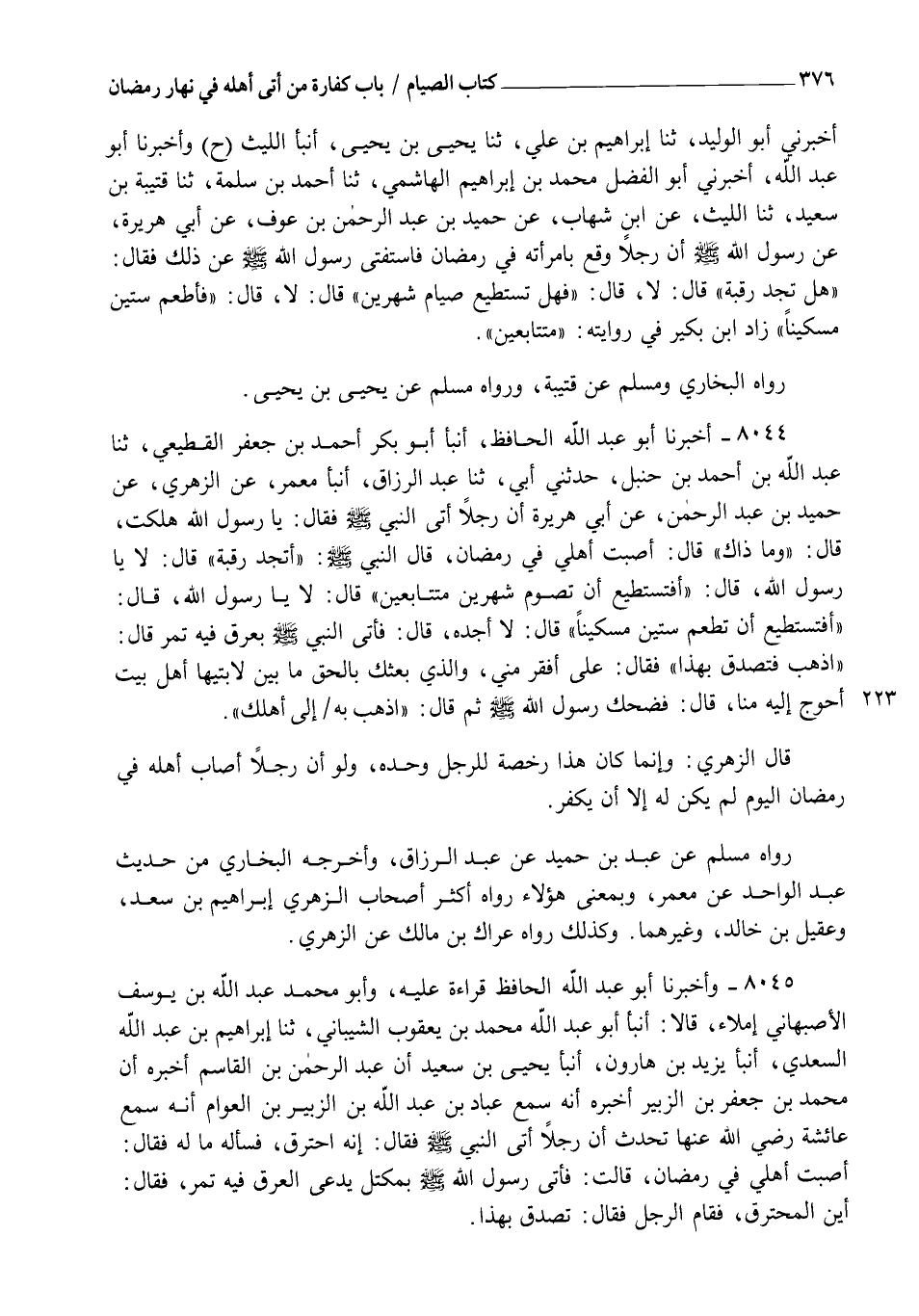 8044 - أَخْبَرَنَا أَبُو عَبْدِ اللهِ الْحَافِظُ، أنبأ أَبُو بَكْرٍ أَحْمَدُ بْنُ جَعْفَرٍ الْقَطِيعِيُّ , ثنا عَبْدُ اللهِ بْنُ أَحْمَدَ بْنِ حَنْبَلٍ، حدَّثَنِي أَبِي، ثنا عَبْدُ الرَّزَّاقِ، أنبأ مَعْمَرٌ، عَنِ الزُّهْرِيِّ، عَنْ حُمَيْدِ بْنِ عَبْدِ الرَّحْمَنِ، عَنْ أَبِي هُرَيْرَةَ أَنَّ رَجُلًا أَتَى النَّبِيَّ صَلَّى اللهُ عَلَيْهِ وَسَلَّمَ فَقَالَ: يَا رَسُولَ اللهِ، هَلَكْتُ , قَالَ: " وَمَا ذَاكَ؟ " قَالَ: أَصَبْتُ أَهْلِي فِي رَمَضَانَ , قَالَ النَّبِيُّ صَلَّى اللهُ عَلَيْهِ وَسَلَّمَ: " §أَتَجِدُ رَقَبَةً؟ " قَالَ: لَا يَا رَسُولَ اللهِ، قَالَ: " أَفَتَسْتَطِيعُ أَنْ تَصُومَ شَهْرَيْنِ مُتَتَابِعَيْنِ؟ " قَالَ: لَا يَا رَسُولَ اللهِ , قَالَ: " أَفَتَسْتَطِيعُ أَنْ تُطْعِمَ سِتِّينَ مِسْكِينًا؟ " قَالَ: لَا أَجِدُهُ , قَالَ: فَأُتِيَ النَّبِيُّ صَلَّى اللهُ عَلَيْهِ وَسَلَّمَ بِعَرَقٍ فِيهِ تَمْرٌ، قَالَ: " اذْهَبْ فَتَصَدَّقْ بِهَذَا "، فَقَالَ: عَلَى أَفْقَرَ مِنِّي , وَالَّذِي بَعَثَكَ بِالْحَقِّ، مَا بَيْنَ لَابَتَيْهَا أَهْلُ بَيْتٍ أَحْوَجُ إِلَيْهِ مِنَّا , قَالَ: فَضَحِكَ رَسُولُ اللهِ صَلَّى اللهُ عَلَيْهِ وَسَلَّمَ ثُمَّ قَالَ: " اذْهَبْ بِهِ إِلَى أَهْلِكَ " قَالَ الزُّهْرِيُّ: وَإِنَّمَا كَانَ هَذَا رُخْصَةً لِلرَّجُلِ وَحْدَهُ , وَلَوْ أَنَّ رَجُلًا أَصَابَ أَهْلَهُ فِي رَمَضَانَ الْيَوْمَ لَمْ يَكُنْ لَهُ إِلَّا أَنْ يُكَفِّرَ رَوَاهُ مُسْلِمٌ عَنْ عَبْدِ بْنِ حُمَيْدٍ عَنْ عَبْدِ الرَّزَّاقِ , وَأَخْرَجَهُ الْبُخَارِيُّ مِنْ حَدِيثِ عَبْدِ الْوَاحِدِ عَنْ مَعْمَرٍ وَبِمَعْنَى هَؤُلَاءِ رَوَاهُ أَكْثَرُ أَصْحَابِ الزُّهْرِيِّ إِبْرَاهِيمُ بْنُ سَعْدٍ , وَعُقَيْلُ بْنُ خَالِدٍ وَغَيْرُهُمَا , وَكَذَلِكَ رَوَاهُ عِرَاكُ بْنُ مَالِكٍ عَنِ الزُّهْرِيِّ