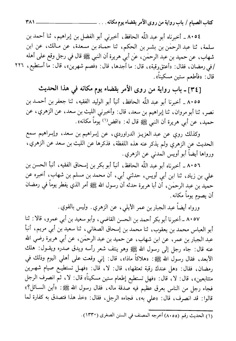 8056 - أَخْبَرَنَاهُ أَبُو عَبْدِ اللهِ الْحَافِظُ، أنبأ أَبُو بَكْرِ بْنُ إِسْحَاقَ الْفَقِيهُ، أنبأ الْحَسَنُ بْنُ عَلِيِّ بْنِ زِيَادٍ، ثنا ابْنُ أَبِي أُوَيْسٍ، حدَّثَنِي أَبِي، أَنَّ مُحَمَّدَ بْنَ مُسْلِمِ بْنِ شِهَابٍ أَخْبَرَهُ , عَنْ حُمَيْدِ بْنِ عَبْدِ الرَّحْمَنِ، أَنَّ أَبَا هُرَيْرَةَ حدَّثَهُ أَنَّ رَسُولَ اللهِ صَلَّى اللهُ عَلَيْهِ وَسَلَّمَ §أَمَرَ الَّذِي يُفْطِرُ يَوْمًا فِي رَمَضَانَ أَنْ يَصُومَ يَوْمًا مَكَانَهُ وَرَوَاهُ أَيْضًا عَبْدُ الْجَبَّارِ بْنُ عُمَرَ الْأَيْلِيُّ عَنِ الزُّهْرِيِّ وَلَيْسَ بِالْقَوِيِّ