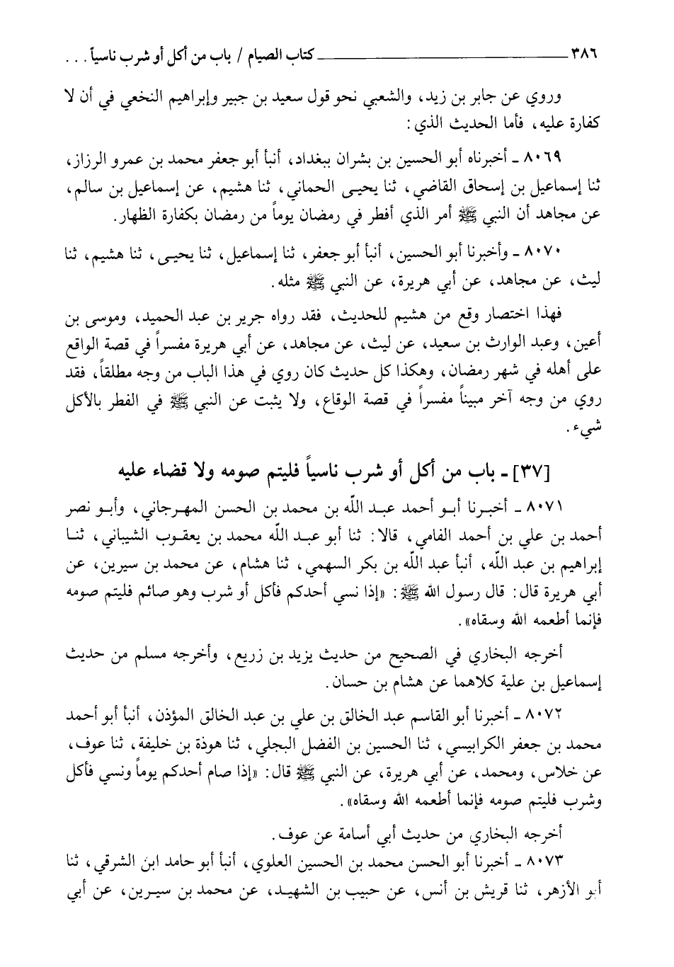 8071 - أَخْبَرَنَا أَبُو أَحْمَدَ عَبْدُ اللهِ بْنُ مُحَمَّدِ بْنِ الْحَسَنِ الْمِهْرَجَانِيُّ، وَأَبُو نَصْرٍ أَحْمَدُ بْنُ عَلِيِّ بْنِ أَحْمَدَ الْفَامِيُّ , قَالَا: ثنا أَبُو عَبْدِ اللهِ مُحَمَّدُ بْنُ يَعْقُوبَ الشَّيْبَانِيُّ , ثنا إِبْرَاهِيمُ بْنُ عَبْدِ اللهِ، أنبأ عَبْدُ اللهِ بْنُ بَكْرٍ السَّهْمِيُّ، ثنا هِشَامٌ، عَنْ مُحَمَّدِ بْنِ سِيرِينَ، عَنْ أَبِي هُرَيْرَةَ، قَالَ: قَالَ رَسُولُ اللهِ صَلَّى اللهُ عَلَيْهِ وَسَلَّمَ: §" إِذَا نَسِيَ أَحَدُكُمْ فَأَكَلَ أَوْ شَرِبَ وَهُوَ صَائِمٌ فَلْيُتِمَّ صَوْمَهُ , فَإِنَّمَا أَطْعَمَهُ اللهُ وَسَقَاهُ ". أَخْرَجَهُ الْبُخَارِيُّ فِي الصَّحِيحِ مِنْ حَدِيثِ يَزِيدَ بْنِ زُرَيْعٍ، وَأَخْرَجَهُ مُسْلِمٌ مِنْ حَدِيثِ إِسْمَاعِيلَ ابْنِ عُلَيَّةَ، كِلَاهُمَا عَنْ هِشَامِ بْنِ حَسَّانَ