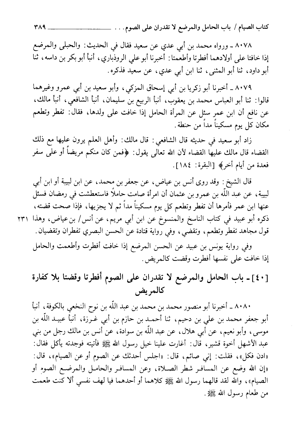 8080 - أَخْبَرَنَا أَبُو مَنْصُورٍ مُحَمَّدُ بْنُ مُحَمَّدِ بْنِ عَبْدِ اللهِ بْنِ نُوحٍ النَّخَعِيُّ بِالْكُوفَةِ , أنبأ أَبُو جَعْفَرٍ مُحَمَّدُ بْنُ عَلِيِّ بْنِ دُحَيْمٍ , ثنا أَحْمَدُ بْنُ حَازِمِ بْنِ أَبِي غَرَزَةَ، أنبأ عُبَيْدُ اللهِ بْنُ مُوسَى، وَأَبُو نُعَيْمٍ عَنْ أَبِي هِلَالٍ، عَنْ عَبْدِ اللهِ بْنِ سَوَادَةَ، عَنْ أَنَسِ بْنِ مَالِكٍ رَجُلٍ مِنْ بَنِي عَبْدِ الْأَشْهَلِ إِخْوَةِ قُشَيْرٍ قَالَ: أَغَارَتْ عَلَيْنَا خَيْلُ رَسُولِ اللهِ صَلَّى اللهُ عَلَيْهِ وَسَلَّمَ فَأَتَيْتُهُ فَوَجَدْتُهُ يَأْكُلُ , فَقَالَ: " ادْنُ فَكُلْ " فَقُلْتُ: إِنِّي صَائِمٌ , قَالَ: " اجْلِسْ أُحَدِّثْكَ عَنِ الصَّوْمِ أَوْ عَنِ الصِّيَامِ " قَالَ: " إِنَّ §اللهَ وَضَعَ عَنِ الْمُسَافِرِ شَطْرَ الصَّلَاةِ، وَعَنِ الْمُسَافِرِ وَالْحَامِلِ وَالْمُرْضِعِ الصَّوْمَ " أَوِ الصِّيَامَ، وَاللهِ لَقَدْ قَالَهُمَا رَسُولُ اللهِ صَلَّى اللهُ عَلَيْهِ وَسَلَّمَ كِلَاهُمَا أَوْ أَحَدَهُمَا، فَيَا لَهْفَ نَفْسِي أَلَّا كُنْتُ طَعِمْتُ مِنْ طَعَامِ رَسُولِ اللهِ صَلَّى اللهُ عَلَيْهِ وَسَلَّمَ -[390]- وَقَالَ غَيْرُهُ: رَجُلٌ مِنْ بَنِي عَبْدِ اللهِ بْنِ كَعْبٍ إِخْوَةِ بَنِي قُشَيْرٍ، كَذَا رَوَاهُ أَبُو هِلَالٍ الرَّاسِبِيُّ دُونَ ذِكْرِ أَبِيهِ فِيهِ وَرَوَاهُ وُهَيْبٌ عَنْ عَبْدِ اللهِ بْنِ سَوَادَةَ، عَنْ أَبِيهِ، عَنْ أَنَسِ بْنِ مَالِكٍ