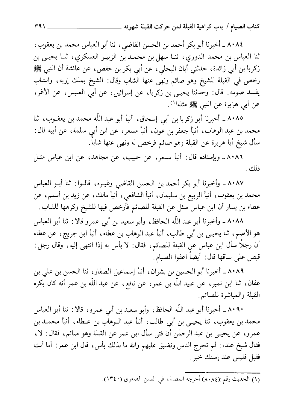 8089 - أَخْبَرَنَا أَبُو الْحُسَيْنِ بْنُ بِشْرَانَ، أنبأ إِسْمَاعِيلُ الصَّفَّارُ، ثنا الْحَسَنُ بْنُ عَلِيِّ بْنِ عَفَّانَ، ثنا ابْنُ نُمَيْرٍ، عَنْ عُبَيْدِ اللهِ بْنِ عُمَرَ، عَنْ نَافِعٍ، عَنْ عَبْدِ اللهِ بْنِ عُمَرَ أَنَّهُ §كَانَ يَكْرَهُ الْقُبْلَةَ وَالْمُبَاشَرَةَ لِلصَّائِمِ