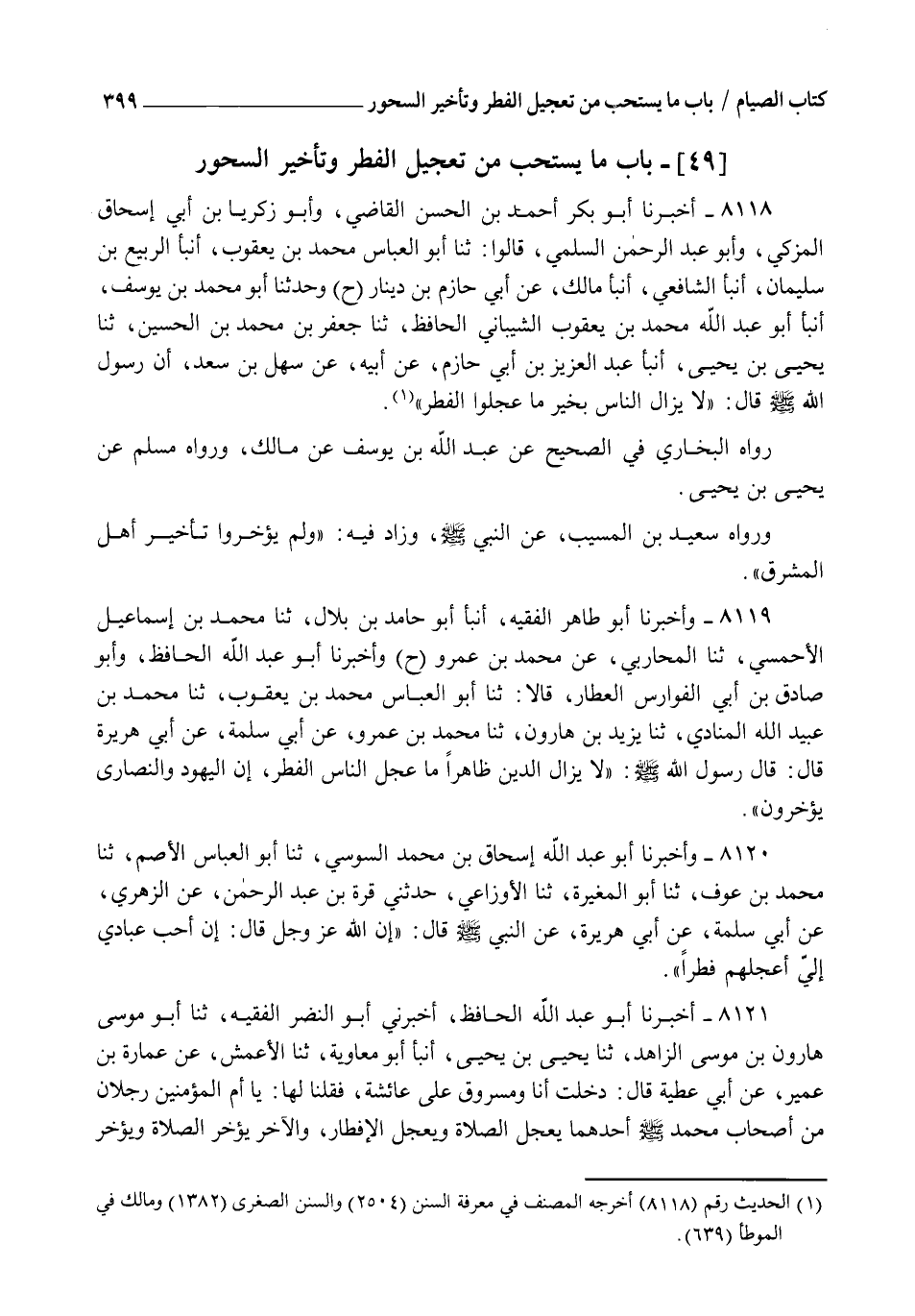 8118 - أَخْبَرَنَا أَبُو بَكْرٍ أَحْمَدُ بْنُ الْحَسَنِ الْقَاضِي، وَأَبُو زَكَرِيَّا بْنُ أَبِي إِسْحَاقَ الْمُزَكِّي، وَأَبُو عَبْدِ الرَّحْمَنِ السُّلَمِيُّ , قَالُوا: ثنا أَبُو الْعَبَّاسِ مُحَمَّدُ بْنُ يَعْقُوبَ، أنبأ الرَّبِيعُ بْنُ سُلَيْمَانَ، أنبأ الشَّافِعِيُّ، أنبأ مَالِكٌ، عَنْ أَبِي حَازِمِ بْنِ دِينَارٍ، ح وَحَدَّثَنَا أَبُو مُحَمَّدِ بْنُ يُوسُفَ، أنبأ أَبُو عَبْدِ اللهِ مُحَمَّدُ بْنُ يَعْقُوبَ الشَّيْبَانِيُّ الْحَافِظُ , ثنا جَعْفَرُ بْنُ مُحَمَّدِ بْنِ الْحُسَيْنِ، ثنا يَحْيَى بْنُ يَحْيَى، أنبأ عَبْدُ الْعَزِيزِ بْنُ أَبِي حَازِمٍ، عَنْ أَبِيهِ، عَنْ سَهْلِ بْنِ سَعْدٍ، أَنَّ رَسُولَ اللهِ صَلَّى اللهُ عَلَيْهِ وَسَلَّمَ , قَالَ: §" لَا يَزَالُ النَّاسُ بِخَيْرٍ مَا عَجَّلُوا الْفِطْرَ " رَوَاهُ الْبُخَارِيُّ فِي الصَّحِيحِ عَنْ عَبْدِ اللهِ بْنِ يُوسُفَ عَنْ مَالِكٍ، وَرَوَاهُ مُسْلِمٌ عَنْ يَحْيَى بْنِ يَحْيَى وَرَوَاهُ سَعِيدُ بْنُ الْمُسَيِّبِ عَنِ النَّبِيِّ صَلَّى اللهُ عَلَيْهِ وَسَلَّمَ وَزَادَ فِيهِ: " وَلَمْ يُؤَخِّرُوا تَأْخِيرَ أَهْلِ الْمَشْرِقِ "