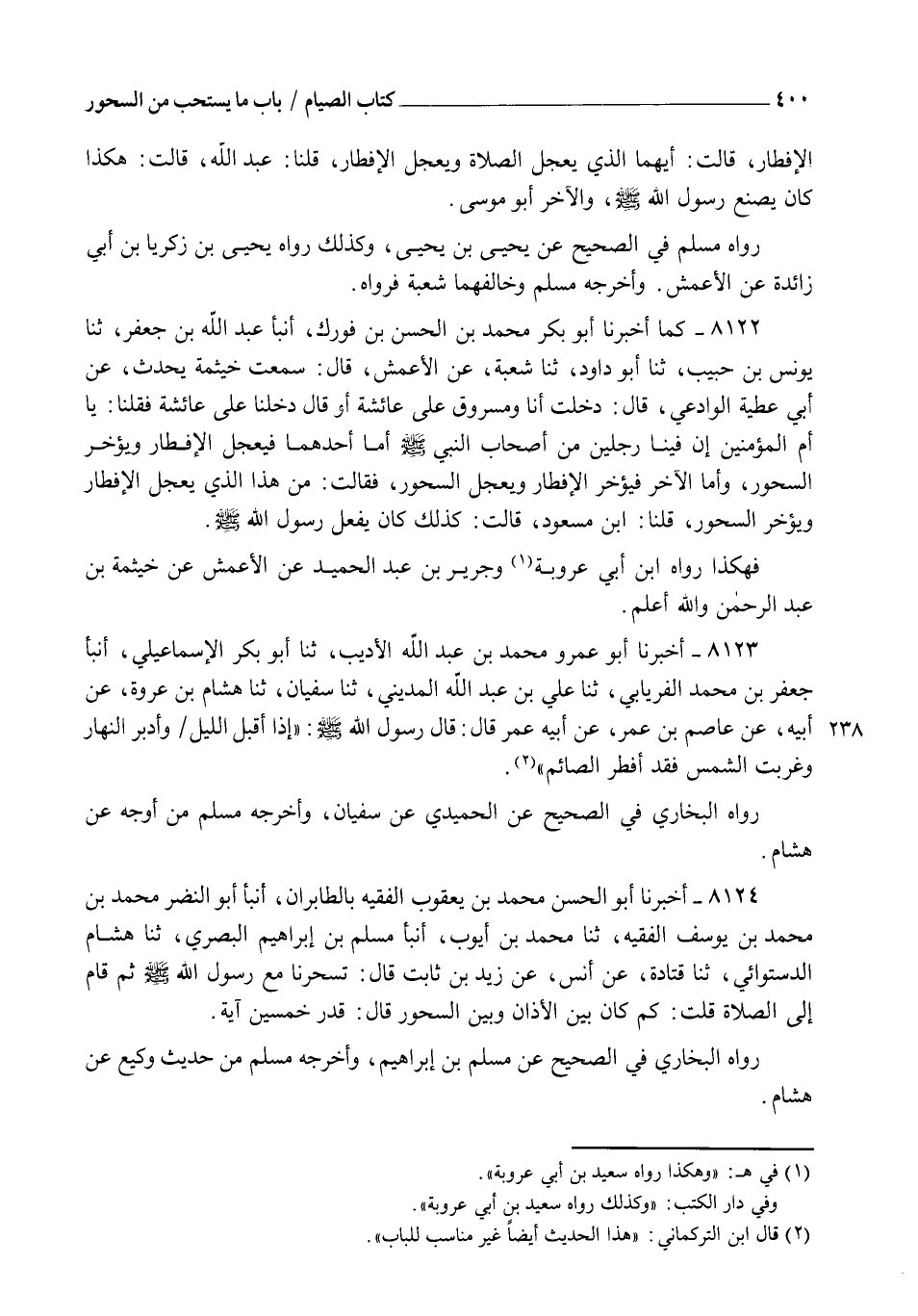 8122 - كَمَا أَخْبَرَنَا أَبُو بَكْرٍ مُحَمَّدُ بْنُ الْحَسَنِ بْنِ فُورَكٍ , أنبأ عَبْدُ اللهِ بْنُ جَعْفَرٍ، ثنا يُونُسُ بْنُ حَبِيبٍ، ثنا أَبُو دَاوُدَ، ثنا شُعْبَةُ، عَنِ الْأَعْمَشِ، قَالَ: سَمِعْتُ خَيْثَمَةَ، يُحَدِّثُ عَنْ أَبِي عَطِيَّةَ الْوَادِعِيِّ، قَالَ: دَخَلْتُ أَنَا وَمَسْرُوقٌ عَلَى عَائِشَةَ، أَوْ قَالَ: دَخَلْنَا عَلَى عَائِشَةَ , فَقُلْنَا: يَا أُمَّ الْمُؤْمِنِينَ، إِنَّ فِينَا رَجُلَيْنِ مِنْ أَصْحَابِ النَّبِيِّ صَلَّى اللهُ عَلَيْهِ وَسَلَّمَ، أَمَّا أَحَدُهُمَا فَيُعَجِّلُ الْإِفْطَارَ وَيُؤَخِّرُ السُّحُورَ , وَأَمَّا الْآخَرُ فَيُؤَخِرُ الْإِفْطَارَ وَيُعَجِّلُ السُّحُورَ , فَقَالَتْ: " مَنْ هَذَا الَّذِي §يُعَجِّلُ الْإِفْطَارَ وَيُؤَخِّرُ السُّحُورَ؟ " قُلْنَا: ابْنُ مَسْعُودٍ , قَالَتْ: " كَذَلِكَ كَانَ يَفْعَلُ رَسُولُ اللهِ صَلَّى اللهُ عَلَيْهِ وَسَلَّمَ " فَهَكَذَا رَوَاهُ ابْنُ أَبِي عَرُوبَةَ وَجَرِيرُ بْنُ عَبْدِ الْحَمِيدِ عَنِ الْأَعْمَشِ عَنْ خَيْثَمَةَ بْنِ عَبْدِ الرَّحْمَنِ، وَاللهُ أَعْلَمُ