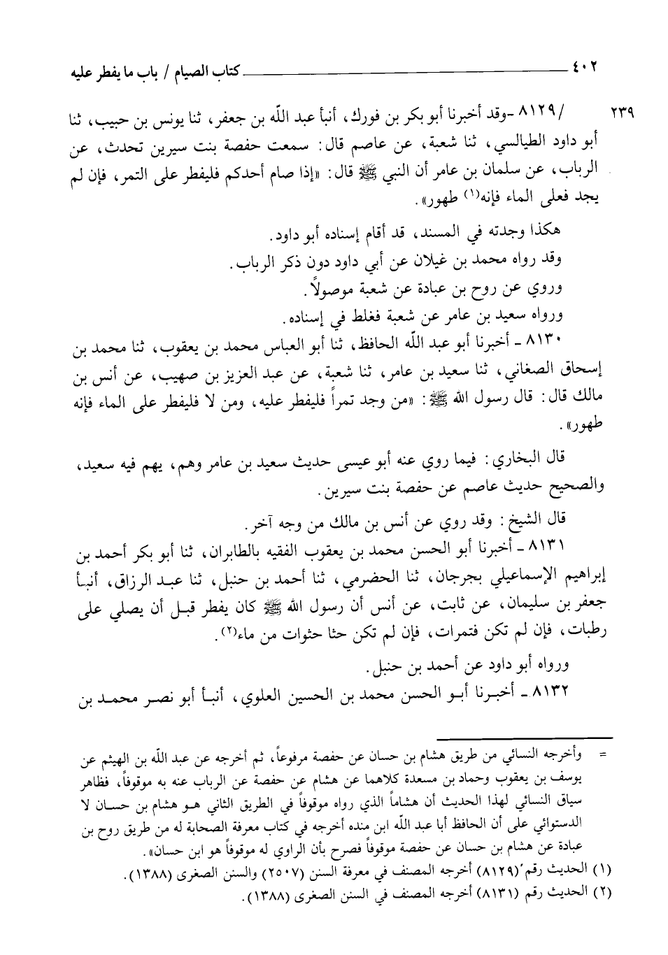 8129 - وَقَدْ أَخْبَرَنَا أَبُو بَكْرِ بْنُ فُورَكٍ، أنبأ عَبْدُ اللهِ بْنُ جَعْفَرٍ، ثنا يُونُسُ بْنُ حَبِيبٍ، ثنا أَبُو دَاوُدَ الطَّيَالِسِيُّ، ثنا شُعْبَةُ، عَنْ عَاصِمٍ، قَالَ: سَمِعْتُ حَفْصَةَ بِنْتِ سِيرِينَ، تُحَدِّثُ عَنِ الرَّبَابِ، عَنْ سَلْمَانَ بْنِ عَامِرٍ، أَنَّ النَّبِيَّ صَلَّى اللهُ عَلَيْهِ وَسَلَّمَ قَالَ: §" إِذَا صَامَ أَحَدُكُمْ فَلْيُفْطِرْ عَلَى التَّمْرِ , فَإِنْ لَمْ يَجِدْ فَعَلَى الْمَاءِ، فَإِنَّهُ طَهُوَرٌ " هَكَذَا وَجَدْتُهُ فِي الْمُسْنَدِ قَدْ أَقَامَ إِسْنَادَهُ أَبُو دَاوُدَ , وَقَدْ رَوَاهُ مُحَمَّدُ بْنُ غَيْلَانَ عَنْ أَبِي دَاوُدَ دُونَ ذِكْرِ الرَّبَابِ، وَرُوِيَ عَنْ رَوْحِ بْنِ عُبَادَةَ عَنْ شُعْبَةَ مَوْصُولًا، وَرَوَاهُ سَعِيدُ بْنُ عَامِرٍ عَنْ شُعْبَةَ فَغَلِطَ فِي إِسْنَادِهِ