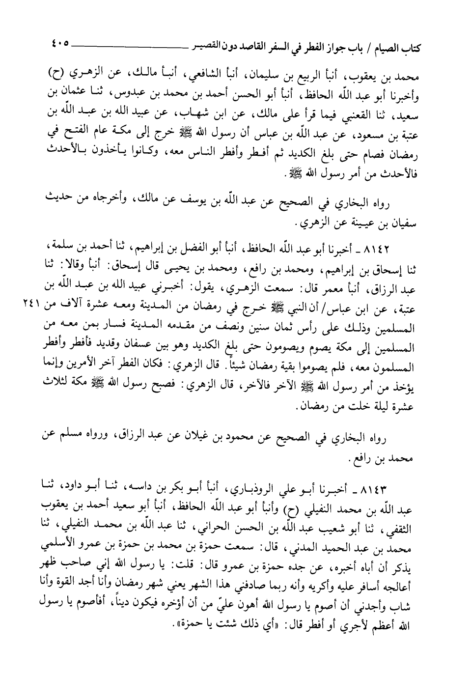 8143 - أَخْبَرَنَا أَبُو عَلِيٍّ الرُّوذْبَارِيُّ، أنبأ أَبُو بَكْرِ بْنُ دَاسَةَ، ثنا أَبُو دَاوُدَ، ثنا عَبْدُ اللهِ بْنُ مُحَمَّدٍ النُّفَيْلِيُّ، ح وَأنبأ أَبُو عَبْدِ اللهِ الْحَافِظُ، أنبأ أَبُو سَعِيدٍ أَحْمَدُ بْنُ يَعْقُوبَ الثَّقَفِيُّ , ثنا أَبُو شُعَيْبٍ عَبْدُ اللهِ بْنُ الْحَسَنِ الْحَرَّانِيُّ، ثنا عَبْدُ اللهِ بْنُ مُحَمَّدٍ النُّفَيْلِيُّ، ثنا مُحَمَّدُ بْنُ عَبْدِ الْحَمِيدِ الْمَدَنِيُّ، قَالَ: سَمِعْتُ حَمْزَةَ بْنَ مُحَمَّدِ بْنِ حَمْزَةَ بْنِ عَمْرٍو الْأَسْلَمِيَّ، يَذْكُرُ أَنَّ أَبَاهُ أَخْبَرَهُ، عَنْ جَدِّهِ حَمْزَةَ بْنِ عَمْرٍو , قَالَ: قُلْتُ: يَا رَسُولَ اللهِ، إِنِّي صَاحِبُ ظَهْرٍ أُعَالِجُهُ، أُسَافِرُ عَلَيْهِ وَأُكْرِيهِ، وَأَنَّهُ رُبَّمَا صَادَفَنِي هَذَا الشَّهْرُ، يَعْنِي شَهْرَ رَمَضَانَ، وَأَنَا أَجِدُ الْقُوَّةَ وَأَنَا شَابٌّ، وَأَجِدُنِي أَنْ §أَصُومَ يَا رَسُولَ اللهِ، أَهْوَنُ عَلَيَّ مِنْ أَنْ أُؤَخِّرَهُ فَيَكُونَ دَيْنًا، أَفَأَصُومُ يَا رَسُولَ اللهِ أَعْظَمَ لِأَجْرِي أَوْ أُفْطِرُ؟ قَالَ: " أِيَّ ذَلِكَ شِئْتَ يَا حَمْزَةُ " -[406]- لَفْظُ حَدِيثِ أَبِي عَبْدِ اللهِ، وَفِي رِوَايَةِ الرُّوذْبَارِيِّ: " أِيَّ ذَلِكَ شِئْتَ يَا حَمْزَةُ " وَفِي هَذَا دَلَالَةٌ عَلَى جَوَازِ الْفِطْرِ فِي السَّفَرِ الْمُبَاحِ