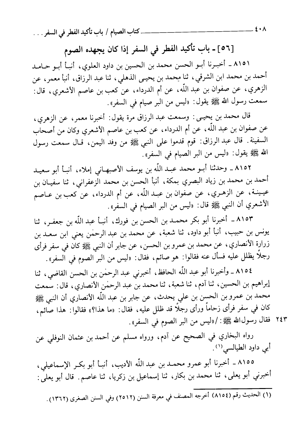 8152 - وَحَدَّثَنَا أَبُو مُحَمَّدٍ عَبْدُ اللهِ بْنُ يُوسُفَ الْأَصْبَهَانِيُّ إِمْلَاءً , أنبأ أَبُو سَعِيدٍ أَحْمَدُ بْنُ مُحَمَّدِ بْنِ زِيَادٍ الْبَصْرِيُّ بِمَكَّةَ , أنبأ الْحَسَنُ بْنُ مُحَمَّدٍ الزَّعْفَرَانِيُّ، ثنا سُفْيَانُ بْنُ عُيَيْنَةَ، عَنِ الزُّهْرِيِّ، عَنْ صَفْوَانَ بْنِ عَبْدِ اللهِ، عَنْ أُمِّ الدَّرْدَاءِ، عَنْ كَعْبِ بْنِ عَاصِمٍ الْأَشْعَرِيِّ، أَنَّ النَّبِيَّ صَلَّى اللهُ عَلَيْهِ وَسَلَّمَ قَالَ: §" لَيْسَ مِنَ الْبِرِّ الصِّيَامُ فِي السَّفَرِ "
