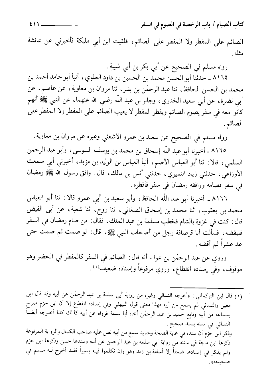 8164 - حَدَّثَنَا أَبُو الْحَسَنِ مُحَمَّدُ بْنُ الْحُسَيْنِ بْنِ دَاوُدَ الْعَلَوِيُّ , أنبأ أَبُو حَامِدٍ أَحْمَدُ بْنُ مُحَمَّدِ بْنِ الْحَسَنِ الْحَافِظُ , ثنا عَبْدُ الرَّحْمَنِ بْنُ بِشْرٍ، ثنا مَرْوَانُ بْنُ مُعَاوِيَةَ، عَنْ عَاصِمٍ، عَنْ أَبِي نَضْرَةَ، عَنْ أَبِي سَعِيدٍ الْخُدْرِيِّ، وَجَابِرِ بْنِ عَبْدِ اللهِ رَضِيَ اللهُ عَنْهُمَا، عَنِ النَّبِيِّ صَلَّى اللهُ عَلَيْهِ وَسَلَّمَ أَنَّهُمْ كَانُوا مَعَهُ فِي سَفَرٍ: §يَصُومُ الصَّائِمُ وَيُفْطِرُ الْمُفْطِرُ، لَا يَعِيبُ الصَّائِمُ عَلَى الْمُفْطِرِ، وَلَا الْمُفْطِرُ عَلَى الصَّائِمِ. رَوَاهُ مُسْلِمٌ فِي الصَّحِيحِ عَنْ سَعِيدِ بْنِ عَمْرٍو الْأَشْعَثِيِّ وَغَيْرُهُ عَنْ مَرْوَانَ بْنِ مُعَاوِيَةَ