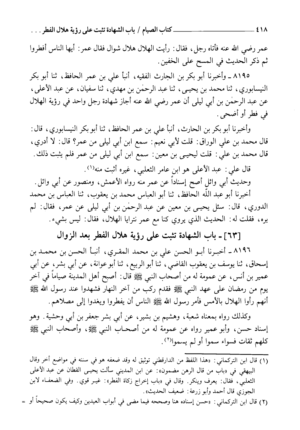 8195 - وَأَخْبَرَنَا أَبُو بَكْرِ بْنُ الْحَارِثِ الْفَقِيهُ، أنبأ عَلِيُّ بْنُ عُمَرَ الْحَافِظُ، ثنا أَبُو بَكْرٍ النَّيْسَابُورِيُّ، ثنا مُحَمَّدُ بْنُ يَحْيَى، ثنا عَبْدُ الرَّحْمَنِ بْنُ مَهْدِيٍّ، ثنا سُفْيَانُ، عَنْ عَبْدِ الْأَعْلَى، عَنْ عَبْدِ الرَّحْمَنِ بْنِ أَبِي لَيْلَى، أَنَّ عُمَرَ رَضِيَ اللهُ عَنْهُ §أَجَازَ شَهَادَةَ رَجُلٍ وَاحِدٍ فِي رُؤْيَةِ الْهِلَالِ فِي فِطْرٍ أَوْ أَضْحَى، وَأَخْبَرَنَا أَبُو بَكْرِ بْنُ الْحَارِثِ، أَنْبَأَ عَلِيُّ بْنُ عُمَرَ الْحَافِظُ , ثنا أَبُو بَكْرٍ النَّيْسَابُورِيُّ , قَالَ: قَالَ مُحَمَّدُ بْنُ عَلِيٍّ الْوَرَّاقُ: قُلْتُ لِأَبِي نُعَيْمٍ: سَمِعَ ابْنُ أَبِي لَيْلَى مِنْ عُمَرَ؟ قَالَ: لَا أَدْرِي , قَالَ مُحَمَّدُ بْنُ عَلِيٍّ: قُلْتُ لِيَحْيَى بْنِ مَعِينٍ: سَمِعَ ابْنُ أَبِي لَيْلَى مِنْ عُمَرَ؟ فَلَمْ يُثْبِتْ ذَلِكَ. قَالَ عَلِيٌّ: عَبْدُ الْأَعْلَى هُوَ ابْنُ عَامِرٍ الثَّعْلَبِيُّ، غَيْرُهُ أَثْبَتُ مِنْهُ , وَحَدِيثُ أَبِي وَائِلٍ أَصَحُّ إِسْنَادًا عَنْ عُمَرَ مِنْهُ , رَوَاهُ الْأَعْمَشُ وَمَنْصُورٌ عَنْ أَبِي وَائِلٍ. أَخْبَرَنَا أَبُو عَبْدِ اللهِ الْحَافِظُ , ثنا أَبُو الْعَبَّاسِ مُحَمَّدُ بْنُ يَعْقُوبَ , ثنا الْعَبَّاسُ بْنُ مُحَمَّدٍ الدُّورِيُّ , قَالَ: سُئِلَ يَحْيَى بْنُ مَعِينٍ عَنْ عَبْدِ الرَّحْمَنِ بْنِ أَبِي لَيْلَى عَنْ عُمَرَ , فَقَالَ: لَمْ يَرَهُ , فَقُلْتُ لَهُ الْحَدِيثَ الَّذِي يَرْوِي: كُنَّا مَعَ عُمَرَ نَتَرَاءَى الْهِلَالَ , فَقَالَ لَيْسَ بِشَيْءٍ