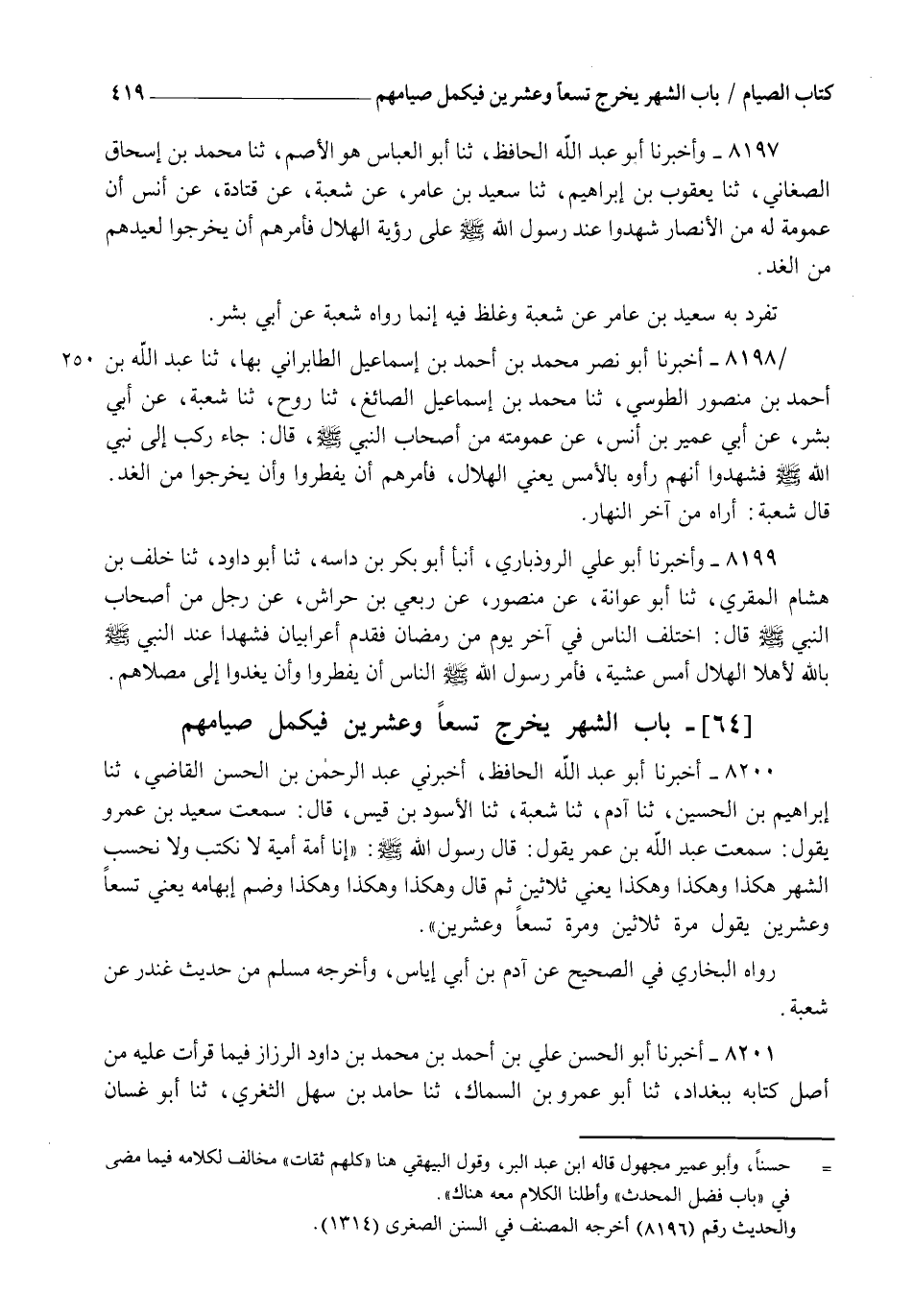 8197 - وَأَخْبَرَنَا أَبُو عَبْدِ اللهِ الْحَافِظُ، ثنا أَبُو الْعَبَّاسِ هُوَ الْأَصَمُّ , ثنا مُحَمَّدُ بْنُ إِسْحَاقَ الصَّغَانِيُّ، ثنا يَعْقُوبُ بْنُ إِبْرَاهِيمَ، ثنا سَعِيدُ بْنُ عَامِرٍ، عَنْ شُعْبَةَ، عَنْ قَتَادَةَ، عَنْ أَنَسٍ أَنَّ عُمُومَةً لَهُ مِنَ الْأَنْصَارِ، §شَهِدُوا عِنْدَ رَسُولِ اللهِ صَلَّى اللهُ عَلَيْهِ وَسَلَّمَ عَلَى رُؤْيَةِ الْهِلَالِ، فَأَمَرَهُمْ أَنْ يَخْرُجُوا لِعِيدِهِمْ مِنَ الْغَدِ تَفَرَّدَ بِهِ سَعِيدُ بْنُ عَامِرٍ عَنْ شُعْبَةَ وَغَلِطَ فِيهِ، إِنَّمَا رَوَاهُ شُعْبَةُ عَنْ أَبِي بِشْرٍ