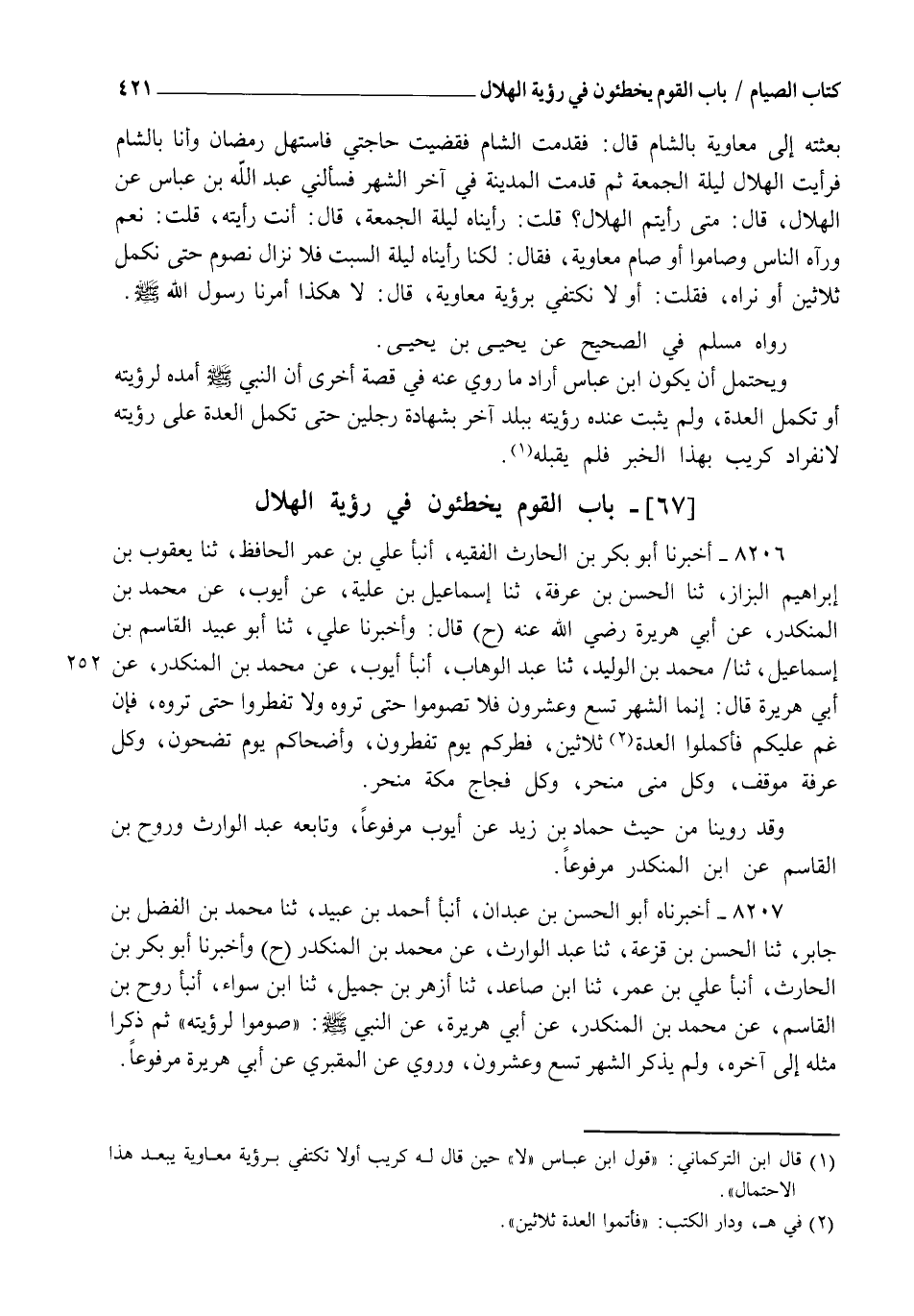 8207 - أَخْبَرَنَاهُ أَبُو الْحَسَنِ بْنُ عَبْدَانَ، أنبأ أَحْمَدُ بْنُ عُبَيْدٍ، ثنا مُحَمَّدُ بْنُ الْفَضْلِ بْنِ جَابِرٍ، ثنا الْحَسَنُ بْنُ قَزَعَةَ، ثنا عَبْدُ الْوَارِثِ، عَنْ مُحَمَّدِ بْنِ الْمُنْكَدِرِ، ح وَأَخْبَرَنَا أَبُو بَكْرِ بْنُ الْحَارِثِ، أنبأ عَلِيُّ بْنُ عُمَرَ، ثنا ابْنُ صَاعِدٍ، ثنا أَزْهَرُ بْنُ جَمِيلٍ، ثنا ابْنُ سَوَاءٍ، أنبأ رَوْحُ بْنُ الْقَاسِمِ، عَنْ مُحَمَّدِ بْنِ الْمُنْكَدِرِ، عَنْ أَبِي هُرَيْرَةَ، عَنِ النَّبِيِّ صَلَّى اللهُ عَلَيْهِ وَسَلَّمَ: " §صُومُوا لِرُؤْيَتِهِ " ثُمَّ ذَكَرَا مِثْلَهُ إِلَى آخِرِهِ، وَلَمْ يَذْكُرِ " الشَّهْرُ تِسْعٌ وَعِشْرُونَ "، وَرُوِيَ عَنِ الْمَقْبُرِيِّ عَنْ أَبِي هُرَيْرَةَ مَرْفُوعًا