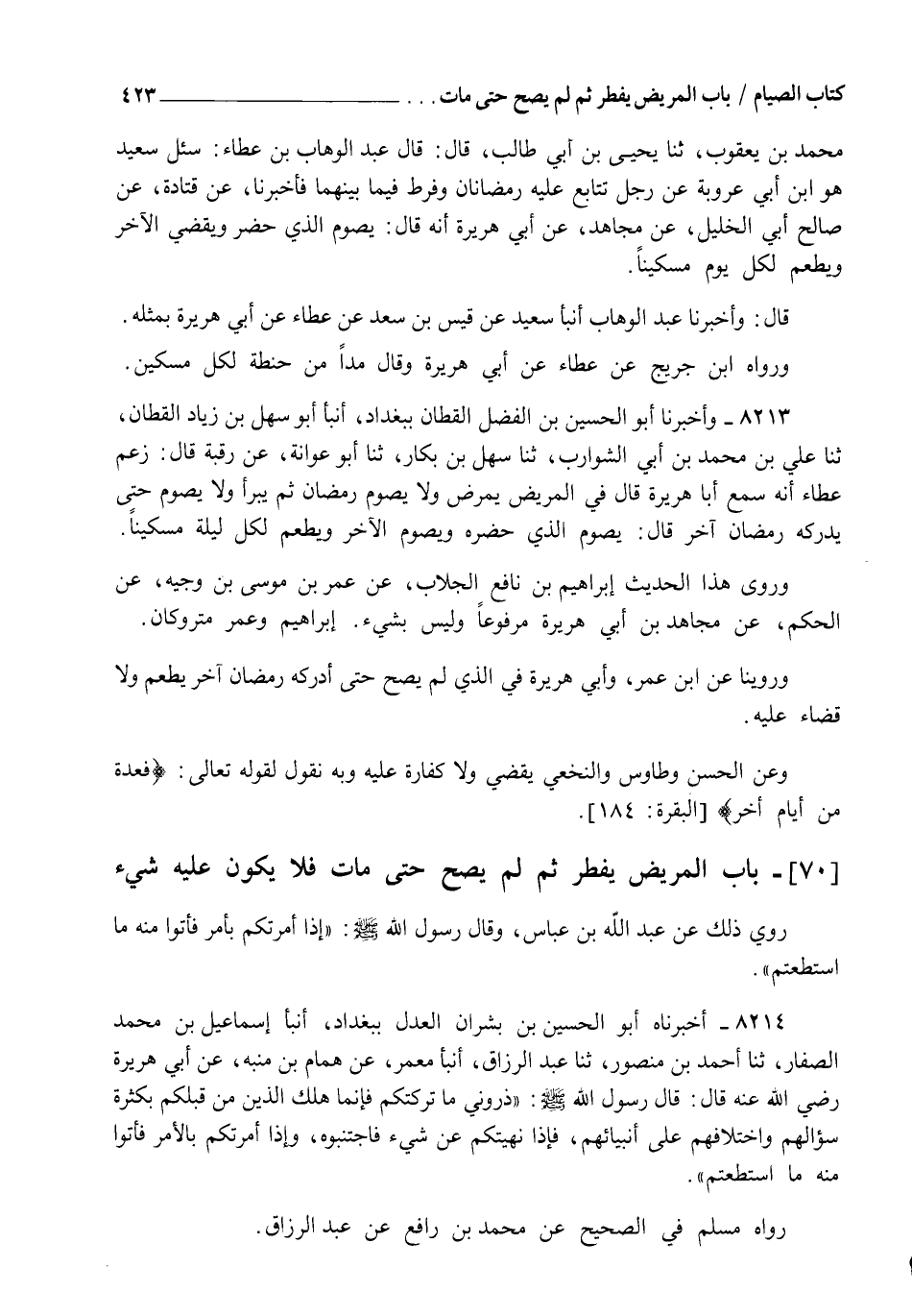 8214 - أَخْبَرَنَاهُ أَبُو الْحُسَيْنِ بْنُ بِشْرَانَ الْعَدْلُ بِبَغْدَادَ , أنبأ إِسْمَاعِيلُ بْنُ مُحَمَّدٍ الصَّفَّارُ، ثنا أَحْمَدُ بْنُ مَنْصُورٍ، ثنا عَبْدُ الرَّزَّاقِ، أنبأ مَعْمَرٌ، عَنْ هَمَّامِ بْنِ مُنَبِّهٍ، عَنْ أَبِي هُرَيْرَةَ رَضِيَ اللهُ عَنْهُ قَالَ: قَالَ رَسُولُ اللهِ صَلَّى اللهُ عَلَيْهِ وَسَلَّمَ: " §ذَرُونِي مَا تَرَكْتُكُمْ، فَإِنَّمَا هَلَكَ الَّذِينَ مِنْ قَبْلِكُمْ بِكَثْرَةِ سُؤَالِهِمْ، وَاخْتِلَافِهِمْ عَلَى أَنْبِيَائِهِمْ , فَإِذَا نَهَيْتُكُمْ عَنْ شَيْءٍ فَاجْتَنِبُوهُ , وَإِذَا أَمَرْتُكُمْ بِالْأَمْرِ فَأْتُوا مِنْهُ مَا اسْتَطَعْتُمْ " رَوَاهُ مُسْلِمٌ فِي الصَّحِيحِ عَنْ مُحَمَّدِ بْنِ رَافِعٍ عَنْ عَبْدِ الرَّزَّاقِ
