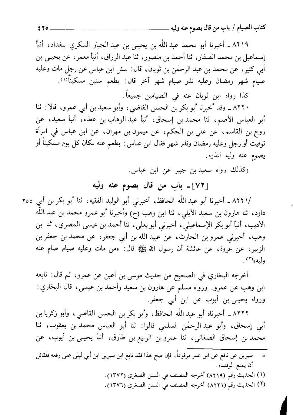 8220 - وَقَدْ أَخْبَرَنَا أَبُو بَكْرِ بْنُ الْحَسَنِ الْقَاضِي، وَأَبُو سَعِيدِ بْنُ أَبِي عَمْرٍو، قَالَا: ثنا أَبُو الْعَبَّاسِ الْأَصَمُّ، ثنا مُحَمَّدُ بْنُ إِسْحَاقَ، أنبأ عَبْدُ الْوَهَّابِ بْنُ عَطَاءٍ، أنبأ سَعِيدٌ، عَنْ رَوْحِ بْنِ الْقَاسِمِ، عَنْ عَلِيِّ بْنِ الْحَكَمِ، عَنْ مَيْمُونِ بْنِ مِهْرَانَ، عَنِ ابْنِ عَبَّاسٍ، فِي امْرَأَةٍ تُوُفِّيَتْ، أَوْ رَجُلٍ، وَعَلَيْهِ رَمَضَانُ، وَنَذْرُ شَهْرٍ، فَقَالَ ابْنُ عَبَّاسٍ: " §يُطْعَمُ عَنْهُ مَكَانَ كُلِّ يَوْمٍ مِسْكِينٌ، أَوْ يَصُومُ عَنْهُ وَلِيُّهُ لِنَذْرِهِ " وَكَذَلِكَ رَوَاهُ سَعِيدُ بْنُ جُبَيْرٍ عَنِ ابْنِ عَبَّاسٍ