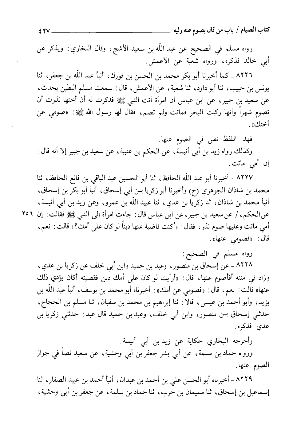 8226 - كَمَا أَخْبَرَنَا أَبُو بَكْرٍ مُحَمَّدُ بْنُ الْحَسَنِ بْنِ فُورَكٍ , أنبأ عَبْدُ اللهِ بْنُ جَعْفَرٍ، ثنا يُونُسُ بْنُ حَبِيبٍ، ثنا أَبُو دَاوُدَ، ثنا شُعْبَةُ، عَنِ الْأَعْمَشِ، قَالَ: سَمِعْتُ مُسْلِمًا الْبَطِينَ، يُحَدِّثُ عَنْ سَعِيدِ بْنِ جُبَيْرٍ، عَنِ ابْنِ عَبَّاسٍ: أَنَّ امْرَأَةً أَتَتِ النَّبِيَّ صَلَّى اللهُ عَلَيْهِ وَسَلَّمَ فَذَكَرَتْ لَهُ أَنَّ أُخْتَهَا نَذَرَتْ أَنْ تَصُومَ شَهْرًا، وَأَنَّهَا رَكِبَتِ الْبَحْرَ فَمَاتَتْ وَلَمْ تَصُمْ، فَقَالَ لَهَا رَسُولُ اللهِ صَلَّى اللهُ عَلَيْهِ وَسَلَّمَ: §" صُوْمِي عَنْ أُخْتِكِ " فَهَذَا اللَّفْظُ نَصٌّ فِي الصَّوْمِ عَنْهَا وَكَذَلِكَ رَوَاهُ زَيْدُ بْنُ أَبِي أُنَيْسَةَ عَنِ الْحَكَمِ بْنِ عُتَيْبَةَ، عَنْ سَعِيدِ بْنِ جُبَيْرٍ إِلَّا أَنَّهُ قَالَ: " إِنَّ أُمِّي مَاتَتْ "