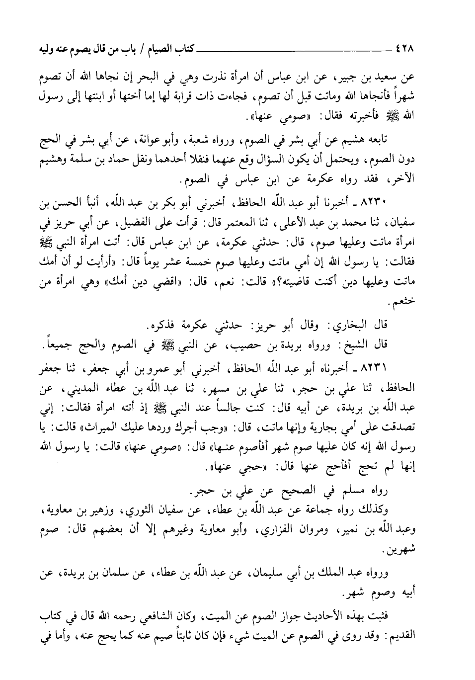 8231 - أَخْبَرَنَاهُ أَبُو عَبْدِ اللهِ الْحَافِظُ، أَخْبَرَنِي أَبُو عَمْرِو بْنُ أَبِي جَعْفَرٍ، ثنا جَعْفَرٌ الْحَافِظُ، ثنا عَلِيُّ بْنُ حُجْرٍ، ثنا عَلِيُّ بْنُ مُسْهِرٍ، ثنا عَبْدُ اللهِ بْنُ عَطَاءٍ الْمَدِينِيُّ، عَنْ عَبْدِ اللهِ بْنِ بُرَيْدَةَ، عَنْ أَبِيهِ، قَالَ: كُنْتُ جَالِسًا عِنْدَ النَّبِيِّ صَلَّى اللهُ عَلَيْهِ وَسَلَّمَ إِذْ أَتَتْهُ امْرَأَةٌ , فَقَالَتْ: إِنِّي تَصَدَّقْتُ عَلَى أُمِّي بِجَارِيَةٍ , وَإِنَّهَا مَاتَتْ , قَالَ: " " §وَجَبَ أَجْرُكِ، وَرَدَّهَا عَلَيْكِ الْمِيرَاثُ " " , قَالَتْ: يَا رَسُولَ اللهِ، إِنَّهُ كَانَ عَلَيْهَا صَوْمُ شَهْرٍ، أَفَأَصُومُ عَنْهَا؟ قَالَ: " " صُوْمِي عَنْهَا " "، قَالَتْ: يَا رَسُولَ اللهِ، إِنَّهَا لَمْ تَحُجَّ، أَفَأَحُجُّ عَنْهَا؟ قَالَ: " " حُجِّي عَنْهَا " " رَوَاهُ مُسْلِمٌ فِي الصَّحِيحِ عَنْ عَلِيِّ بْنِ حُجْرٍ وَكَذَلِكَ رَوَاهُ جَمَاعَةٌ عَنْ عَبْدِ اللهِ بْنِ عَطَاءٍ عَنْ سُفْيَانَ الثَّوْرِيِّ وَزُهَيْرِ بْنِ مُعَاوِيَةَ وَعَبْدِ اللهِ بْنِ نُمَيْرٍ وَمَرْوَانَ الْفَزَارِيِّ وَأَبُو مُعَاوِيَةَ وَغَيْرِهِمْ، إِلَّا أَنَّ بَعْضَهُمْ قَالَ: صَوْمُ شَهْرَيْنِ، وَرَوَاهُ عَبْدُ الْمَلِكِ بْنُ أَبِي سُلَيْمَانَ عَنْ عَبْدِ اللهِ بْنِ عَطَاءٍ عَنْ سَلْمَانَ بْنِ بُرَيْدَةَ عَنْ أَبِيهِ: وَصَوْمُ شَهْرٍ. فَثَبَتَ بِهَذِهِ الْأَحَادِيثِ جَوَازُ الصَّوْمِ عَنِ الْمَيِّتِ , وَكَانَ الشَّافِعِيُّ رَحِمَهُ اللهُ قَالَ فِي كِتَابِ الْقَدِيمِ: وَقَدْ رُوِيَ فِي الصَّوْمِ عَنِ الْمَيِّتِ شَيْءٌ، فَإِنْ كَانَ ثَابِتًا صِيمَ عَنْهُ كَمَا يُحَجُّ عَنْهُ , وَأَمَّا فِي -[429]- الْجَدِيدِ فَإِنَّهُ سَأَلَ عَنْ نَفْسِهِ فَقَالَ: فَإِنْ قِيلَ: فَرُوِيَ أَنَّ رَسُولَ اللهِ صَلَّى اللهُ عَلَيْهِ وَسَلَّمَ أَمَرَ أَحَدًا أَنْ يَصُومَ عَنْ أَحَدٍ , قِيلَ: نَعَمْ، رَوَى ابْنُ عَبَّاسٍ عَنِ النَّبِيِّ صَلَّى اللهُ عَلَيْهِ وَسَلَّمَ , فَإِنْ قِيلَ: فَلِمَ لَا تَأْخُذُ بِهِ , قِيلَ: حَدَّثَ الزُّهْرِيُّ عَنْ عُبَيْدِ اللهِ , عَنِ ابْنِ عَبَّاسٍ , عَنِ النَّبِيِّ صَلَّى اللهُ عَلَيْهِ وَسَلَّمَ نَذْرًا وَلَمْ يُسَمِّهِ مَعَ حِفْظِ الزُّهْرِيِّ وَطُولِ مُجَالَسَةِ عُبَيْدِ اللهِ لِابْنِ عَبَّاسٍ، فَلَمَّا جَاءَ غَيْرُهُ عَنْ رَجُلٍ عَنِ ابْنِ عَبَّاسٍ بِغَيْرِ مَا فِي حَدِيثِ عُبَيْدِ اللهِ أَشْبَهُ أَنْ لَا يَكُونَ مَحْفُوظًا، يَعْنِي بِهِ الْحَدِيثَ الَّذِي