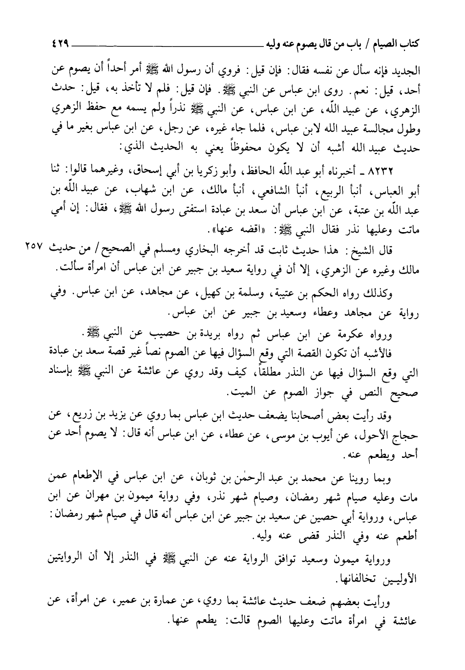 8232 - أَخْبَرَنَاهُ أَبُو عَبْدِ اللهِ الْحَافِظُ، وَأَبُو زَكَرِيَّا بْنُ أَبِي إِسْحَاقَ، وَغَيْرُهُمَا , قَالُوا: ثنا أَبُو الْعَبَّاسِ، أنبأ الرَّبِيعُ، أنبأ الشَّافِعِيُّ، أنبأ مَالِكٌ، عَنِ ابْنِ شِهَابٍ، عَنْ عُبَيْدِ اللهِ بْنِ عَبْدِ اللهِ بْنِ عُتْبَةَ، عَنِ ابْنِ عَبَّاسٍ , أَنَّ سَعْدَ بْنَ عُبَادَةَ اسْتَفْتَى رَسُولَ اللهِ صَلَّى اللهُ عَلَيْهِ وَسَلَّمَ، فَقَالَ: إِنَّ §أُمِّي مَاتَتْ وَعَلَيْهَا نَذْرٌ، فَقَالَ النَّبِيُّ صَلَّى اللهُ عَلَيْهِ وَسَلَّمَ: " اقْضِهِ عَنْهَا " قَالَ الشَّيْخُ: هَذَا حَدِيثٌ ثَابِتٌ، قَدْ أَخْرَجَهُ الْبُخَارِيُّ، وَمُسْلِمٌ فِي الصَّحِيحِ مِنْ حَدِيثِ مَالِكٍ وَغَيْرِهِ عَنِ الزُّهْرِيِّ، إِلَّا أَنَّ فِي رِوَايَةِ سَعِيدِ بْنِ جُبَيْرٍ عَنِ ابْنِ عَبَّاسٍ أَنَّ امْرَأَةً سَأَلَتْ وَكَذَلِكَ رَوَاهُ الْحَكَمُ بْنُ عُتَيْبَةَ وَسَلَمَةُ بْنُ كُهَيْلٍ عَنْ مُجَاهِدٍ , عَنِ ابْنِ عَبَّاسٍ، وَفِي رِوَايَةٍ عَنْ مُجَاهِدٍ وَعَطَاءٍ وَسَعِيدِ بْنِ جُبَيْرٍ عَنِ ابْنِ عَبَّاسٍ، وَرَوَاهُ عِكْرِمَةُ عَنِ ابْنِ عَبَّاسٍ، ثُمَّ رَوَاهُ بُرَيْدَةُ بْنُ حُصَيْبٍ عَنِ النَّبِيِّ صَلَّى اللهُ عَلَيْهِ وَسَلَّمَ، فَالْأَشْبَهُ أَنْ تَكُونَ الْقِصَّةُ الَّتِي وَقَعَ السُّؤَالُ فِيهَا عَنِ الصَّوْمِ نَصًّا غَيْرَ قِصَّةِ سَعْدِ بْنِ عُبَادَةَ الَّتِي وَقَعَ السُّؤَالُ فِيهَا عَنِ النَّذْرِ مُطْلَقًا، كَيْفَ وَقَدْ رُوِيَ عَنْ عَائِشَةَ عَنِ النَّبِيِّ صَلَّى اللهُ عَلَيْهِ وَسَلَّمَ بِإِسْنَادٍ صَحِيحٍ النَّصُّ فِي جَوَازِ الصَّوْمِ عَنِ الْمَيِّتِ، وَقَدْ رَأَيْتُ بَعْضَ أَصْحَابِنَا يُضَعِّفُ حَدِيثَ ابْنِ عَبَّاسٍ بِمَا رُوِيَ عَنْ يَزِيدَ بْنِ زُرَيْعٍ، عَنْ حَجَّاجٍ الْأَحْوَلِ، عَنْ أَيُّوبَ بْنِ مُوسَى، عَنْ عَطَاءٍ، عَنِ ابْنِ عَبَّاسٍ أَنَّهُ قَالَ: لَا يَصُومُ أَحَدٌ عَنْ أَحَدٍ وَيُطْعِمُ عَنْهُ. وَبِمَا رُوِّينَا عَنْ مُحَمَّدِ بْنِ عَبْدِ الرَّحْمَنِ بْنِ ثَوْبَانَ عَنِ ابْنِ عَبَّاسٍ فِي الْإِطْعَامِ عَمَّنْ مَاتَ وَعَلَيْهِ صِيَامُ شَهْرِ رَمَضَانَ وَصِيَامُ شَهْرِ نَذْرٍ، وَفِي رِوَايَةِ مَيْمُونِ بْنِ مِهْرَانَ عَنِ ابْنِ عَبَّاسٍ، وَرِوَايَةِ أَبِي حُصَيْنٍ عَنْ سَعِيدِ بْنِ جُبَيْرٍ عَنِ ابْنِ عَبَّاسٍ أَنَّهُ قَالَ فِي صِيَامِ شَهْرِ رَمَضَانَ: " أَطْعِمْ عَنْهُ "، وَفِي النَّذْرِ قَضَى عَنْهُ وَلِيُّهُ. وَرِوَايَةُ مَيْمُونٍ وَسَعِيدٍ تُوَافِقُ الرِّوَايَةَ عَنْهُ عَنِ النَّبِيِّ صَلَّى اللهُ عَلَيْهِ وَسَلَّمَ فِي النَّذْرِ إِلَّا أَنَّ الرِّوَايَتَيْنِ الْأُولَيَيْنِ تُخَالِفَانِهَا , وَرَأَيْتُ بَعْضَهُمْ ضَعَّفَ حَدِيثَ عَائِشَةَ بِمَا رُوِيَ عَنْ عُمَارَةَ بْنِ عُمَيْرٍ عَنِ امْرَأَةٍ عَنْ عَائِشَةَ فِي امْرَأَةٍ مَاتَتْ وَعَلَيْهَا الصَّوْمُ , قَالَتْ: يُطْعَمُ عَنْهَا. -[430]- وَرُوِيَ مِنْ وَجْهٍ آخَرَ عَنْ عَائِشَةَ أَنَّهَا قَالَتْ: لَا تَصُومُوا عَنْ مَوْتَاكُمْ , وَأَطْعِمُوا عَنْهُمْ. وَلَيْسَ فِيمَا ذَكَرُوا مَا يُوجِبُ لِلْحَدِيثِ ضَعْفًا، فَمَنْ يُجَوِّزُ الصِّيَامَ عَنِ الْمَيِّتِ يُجَوِّزُ الْإِطْعَامَ عَنْهُ، وَفِيمَا رُوِيَ عَنْهُمَا فِي النَّهْيِ عَنِ الصَّوْمِ عَنِ الْمَيِّتِ نَظَرٌ , وَالْأَحَادِيثُ الْمَرْفُوعَةُ أَصَحُّ إِسْنَادًا وَأَشْهَرُ رِجَالًا، وَقَدْ أَوْدَعَهَا صَاحِبَا الصَّحِيحِ كِتَابَيْهِمَا، وَلَوْ وَقَفَ الشَّافِعِيُّ رَحِمَهُ اللهُ عَلَى جَمِيعِ طُرُقِهَا وَتَظَاهُرِهَا لَمْ يُخَالِفْهَا إِنْ شَاءَ اللهُ تَعَالَى , وَبِاللهِ التَّوْفِيقُ. وَمِمَّنْ رَأَى جَوَازَ الصِّيَامِ عَنِ الْمَيِّتِ طَاوُسٌ وَالْحَسَنُ الْبَصْرِيُّ وَالزُّهْرِيُّ وَقَتَادَةُ