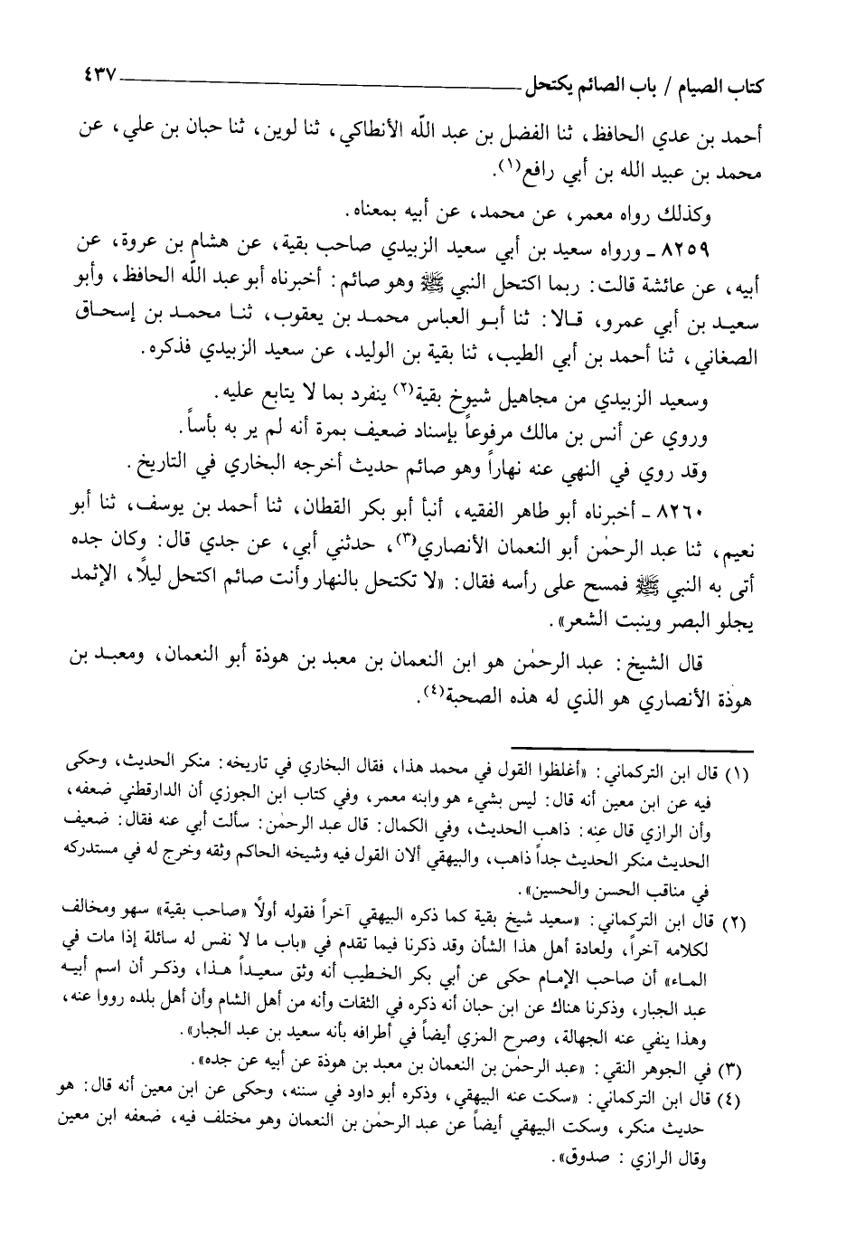 8259 - وَرَوَاهُ سَعِيدُ بْنُ أَبِي سَعِيدٍ الزُّبَيْدِيُّ صَاحِبُ بَقِيَّةَ عَنْ هِشَامِ بْنِ عُرْوَةَ، عَنْ أَبِيهِ، عَنْ عَائِشَةَ، قَالَتْ: §" رُبَّمَا اكْتَحَلَ النَّبِيُّ صَلَّى اللهُ عَلَيْهِ وَسَلَّمَ وَهُوَ صَائِمٌ " أَخْبَرَنَاهُ أَبُو عَبْدِ اللهِ الْحَافِظُ وَأَبُو سَعِيدِ بْنُ أَبِي عَمْرٍو قَالَا: ثنا أَبُو الْعَبَّاسِ مُحَمَّدُ بْنُ يَعْقُوبَ ثنا مُحَمَّدُ بْنُ إِسْحَاقَ الصَّغَانِيُّ , ثنا أَحْمَدُ بْنُ أَبِي الطَّيِّبِ , ثنا بَقِيَّةُ بْنُ الْوَلِيدِ عَنْ سَعِيدٍ الزُّبَيْدِيِّ فَذَكَرَهُ. وَسَعِيدٌ الزُّبَيْدِيُّ مِنْ مَجَاهِيلِ شُيُوخِ بَقِيَّةَ يَنْفَرِدُ بِمَا لَا يُتَابَعُ عَلَيْهِ وَرُوِيَ عَنْ أَنَسِ بْنِ مَالِكٍ مَرْفُوعًا بِإِسْنَادٍ ضَعِيفٍ بِمَرَّةٍ أَنَّهُ لَمْ يَرَ بِهِ بَأْسًا. وَقَدْ رُوِيَ فِي النَّهْيِ عَنْهُ نَهَارًا وَهُوَ صَائِمٌ حَدِيثٌ أَخْرَجَهُ الْبُخَارِيُّ فِي التَّارِيخِ