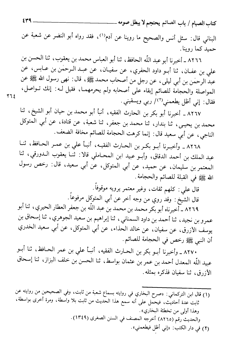 8266 - أَخْبَرَنَا أَبُو عَبْدِ اللهِ الْحَافِظُ، ثنا أَبُو الْعَبَّاسِ مُحَمَّدُ بْنُ يَعْقُوبَ , ثنا الْحَسَنُ بْنُ عَلِيِّ بْنِ عَفَّانَ، ثنا أَبُو دَاوُدَ الْحَفَرِيُّ، عَنْ سُفْيَانَ، عَنْ عَبْدِ الرَّحْمَنِ بْنِ عَابِسٍ، عَنْ عَبْدِ الرَّحْمَنِ بْنِ أَبِي لَيْلَى، عَنْ رَجُلٍ مِنْ أَصْحَابِ مُحَمَّدٍ صَلَّى اللهُ عَلَيْهِ وَسَلَّمَ قَالَ: §نَهَى رَسُولُ اللهِ صَلَّى اللهُ عَلَيْهِ وَسَلَّمَ عَنِ الْمُوَاصَلَةِ وَالْحِجَامَةِ لِلصَّائِمِ إِبْقَاءً عَلَى أَصْحَابِهِ وَلَمْ يُحَرِّمْهُمَا , فَقِيلَ لَهُ: إِنَّكَ تُوَاصِلُ , فَقَالَ: " إِنِّي أَظَلُّ يُطْعِمُنِي رَبِّي وَيَسْقِينِي "