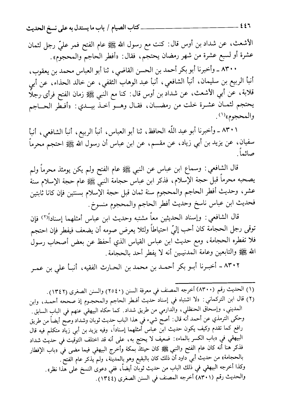 8300 - وَأَخْبَرَنَا أَبُو بَكْرٍ أَحْمَدُ بْنُ الْحَسَنِ الْقَاضِي , ثنا أَبُو الْعَبَّاسِ مُحَمَّدُ بْنُ يَعْقُوبَ , أنبأ الرَّبِيعُ بْنُ سُلَيْمَانَ، أنبأ الشَّافِعِيُّ، أنبأ عَبْدُ الْوَهَّابِ الثَّقَفِيُّ، عَنْ خَالِدٍ الْحَذَّاءِ، عَنْ أَبِي قِلَابَةَ، عَنْ أَبِي الْأَشْعَثِ، عَنْ شَدَّادِ بْنِ أَوْسٍ قَالَ: كُنَّا مَعَ النَّبِيِّ صَلَّى اللهُ عَلَيْهِ وَسَلَّمَ زَمَانَ الْفَتْحِ فَرَأَى رَجُلًا يَحْتَجِمُ لِثَمَانِ عَشْرَةَ خَلَتْ مِنْ رَمَضَانَ , فَقَالَ وَهُوَ آخِذٌ بِيَدِي: §" أَفْطَرَ الْحَاجِمُ وَالْمَحْجُومُ "