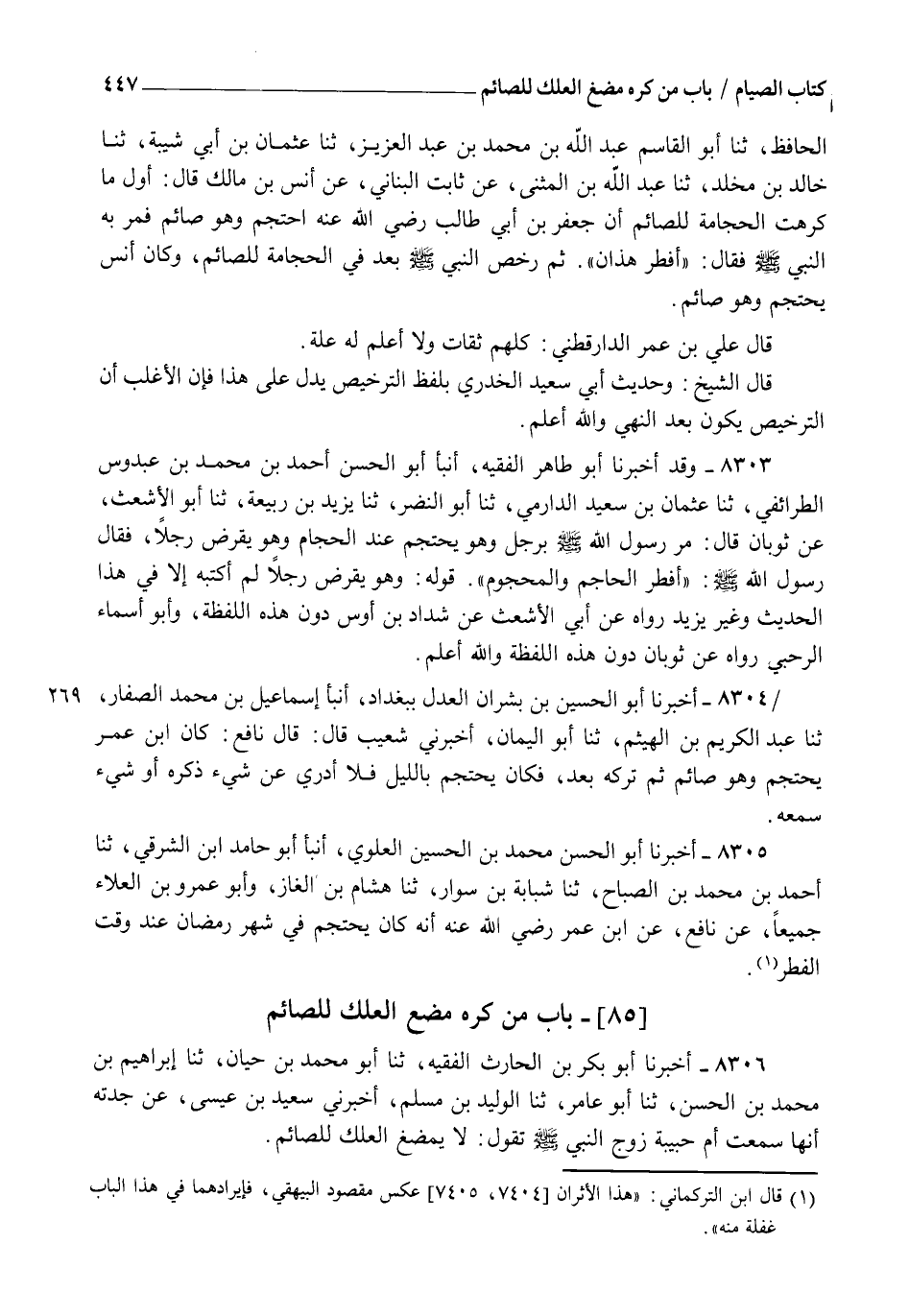 8305 - أَخْبَرَنَا أَبُو الْحَسَنِ مُحَمَّدُ بْنُ الْحُسَيْنِ الْعَلَوِيُّ , أنبأ أَبُو حَامِدِ بْنُ الشَّرْقِيِّ، ثنا أَحْمَدُ بْنُ مُحَمَّدِ بْنِ الصَّبَّاحِ، ثنا شَبَابَةُ بْنُ سَوَّارٍ، ثنا هِشَامُ بْنُ الْغَازِ، وَأَبُو عَمْرِو بْنُ الْعَلَاءِ جَمِيعًا عَنْ نَافِعٍ، عَنِ ابْنِ عُمَرَ رَضِيَ اللهُ عَنْهُ أَنَّهُ §كَانَ يَحْتَجِمُ فِي شَهْرِ رَمَضَانَ عِنْدَ وَقْتِ الْفِطْرِ