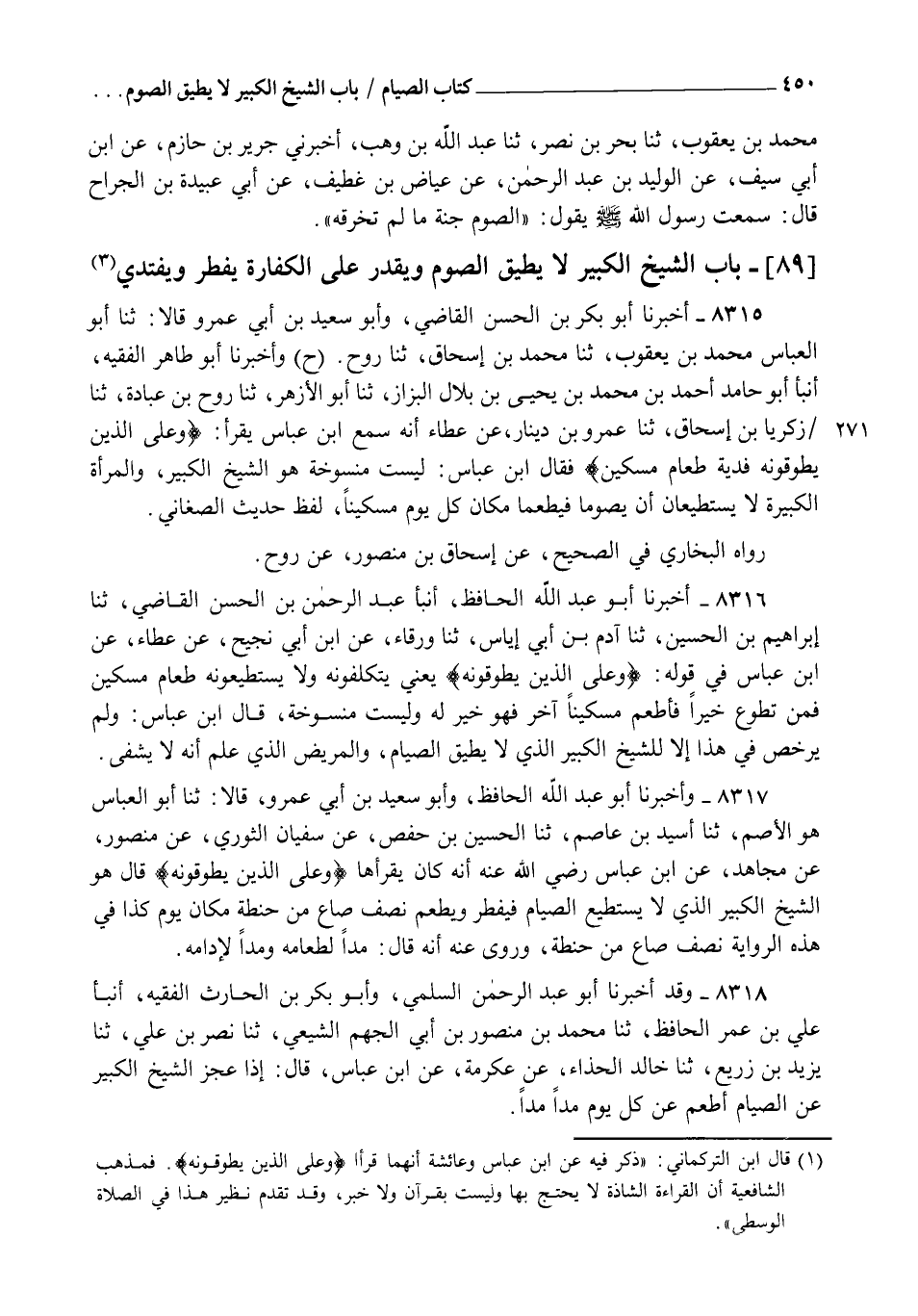 8315 - أَخْبَرَنَا أَبُو بَكْرِ بْنُ الْحَسَنِ الْقَاضِي، وَأَبُو سَعِيدِ بْنُ أَبِي عَمْرٍو قَالَا: ثنا أَبُو الْعَبَّاسِ مُحَمَّدُ بْنُ يَعْقُوبَ , ثنا مُحَمَّدُ بْنُ إِسْحَاقَ، ثنا رَوْحٌ، ح وَأَخْبَرَنَا أَبُو طَاهِرٍ الْفَقِيهُ، أنبأ أَبُو حَامِدٍ أَحْمَدُ بْنُ مُحَمَّدِ بْنِ يَحْيَى بْنِ بِلَالٍ الْبَزَّازُ , ثنا أَبُو الْأَزْهَرِ، ثنا رَوْحُ بْنُ عُبَادَةَ، ثنا زَكَرِيَّا بْنُ إِسْحَاقَ ثنا عَمْرُو بْنُ دِينَارٍ، عَنْ عَطَاءٍ، أَنَّهُ سَمِعَ ابْنَ عَبَّاسٍ يَقْرَأُ: " وَعَلَى الَّذِينَ يُطَوَّقُونَهُ فِدْيَةٌ طَعَامُ مِسْكِينٍ " فَقَالَ ابْنُ عَبَّاسٍ: " لَيْسَتْ مَنْسُوخَةً §هُوَ الشَّيْخُ الْكَبِيرُ وَالْمَرْأَةُ الْكَبِيرَةُ لَا يَسْتَطِيعَانِ أَنْ يَصُومَا فَيُطْعِمَا مَكَانَ كُلِّ يَوْمٍ مِسْكِينًا ". لَفْظُ حَدِيثِ الصَّنْعَانِيِّ رَوَاهُ الْبُخَارِيُّ فِي الصَّحِيحِ عَنْ إِسْحَاقَ بْنِ مَنْصُورٍ عَنْ رَوْحٍ