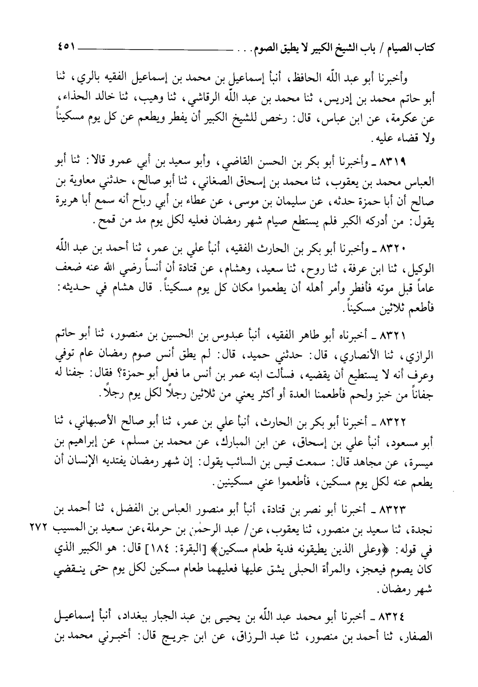 8323 - أَخْبَرَنَا أَبُو نَصْرِ بْنُ قَتَادَةَ أنبأ أَبُو مَنْصُورٍ الْعَبَّاسُ بْنُ الْفَضْلِ، ثنا أَحْمَدُ بْنُ نَجْدَةَ، ثنا سَعِيدُ بْنُ مَنْصُورٍ، ثنا يَعْقُوبُ، عَنْ عَبْدِ الرَّحْمَنِ بْنِ حَرْمَلَةَ، عَنْ سَعِيدِ بْنِ الْمُسَيِّبِ، فِي قَوْلِهِ {§وَعَلَى الَّذِينَ يُطِيقُونَهُ فِدْيَةٌ طَعَامُ مِسْكِينٍ} [البقرة: 184] قَالَ: " هُوَ الْكَبِيرُ الَّذِي كَانَ يَصُومُ فَيَعْجِزُ وَالْمَرْأَةُ الْحُبْلَى يَشُقُّ عَلَيْهَا فَعَلَيْهِمَا طَعَامُ مِسْكِينٍ لِكُلِّ يَوْمٍ حَتَّى يَنْقَضِيَ شَهْرُ رَمَضَانَ "