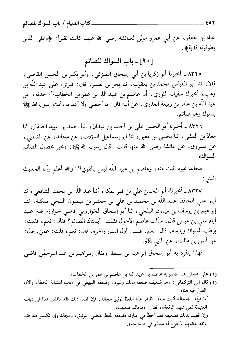 8325 - أَخْبَرَنَا أَبُو زَكَرِيَّا بْنُ أَبِي إِسْحَاقَ الْمُزَكِّي، وَأَبُو بَكْرِ بْنُ الْحَسَنِ الْقَاضِي قَالَا: ثنا أَبُو الْعَبَّاسِ مُحَمَّدُ بْنُ يَعْقُوبَ , ثنا بَحْرُ بْنُ نَصْرٍ قَالَ: قُرِئَ عَلَى عَبْدِ اللهِ بْنِ وَهْبٍ أَخْبَرَكَ سُفْيَانُ الثَّوْرِيُّ، أَنَّ عَاصِمَ بْنَ عُبَيْدِ اللهِ بْنِ عُمَرَ بْنِ الْخَطَّابِ حَدَّثَهُ , عَنْ عَبْدِ اللهِ بْنِ عَامِرِ بْنِ رَبِيعَةَ الْعَدَوِيِّ، عَنْ أَبِيهِ قَالَ: مَا أُحْصِي وَلَا أَعُدُّ مَا رَأَيْتُ رَسُولَ اللهِ صَلَّى اللهُ عَلَيْهِ وَسَلَّمَ §يَتَسَوَّكُ وَهُوَ صَائِمٌ