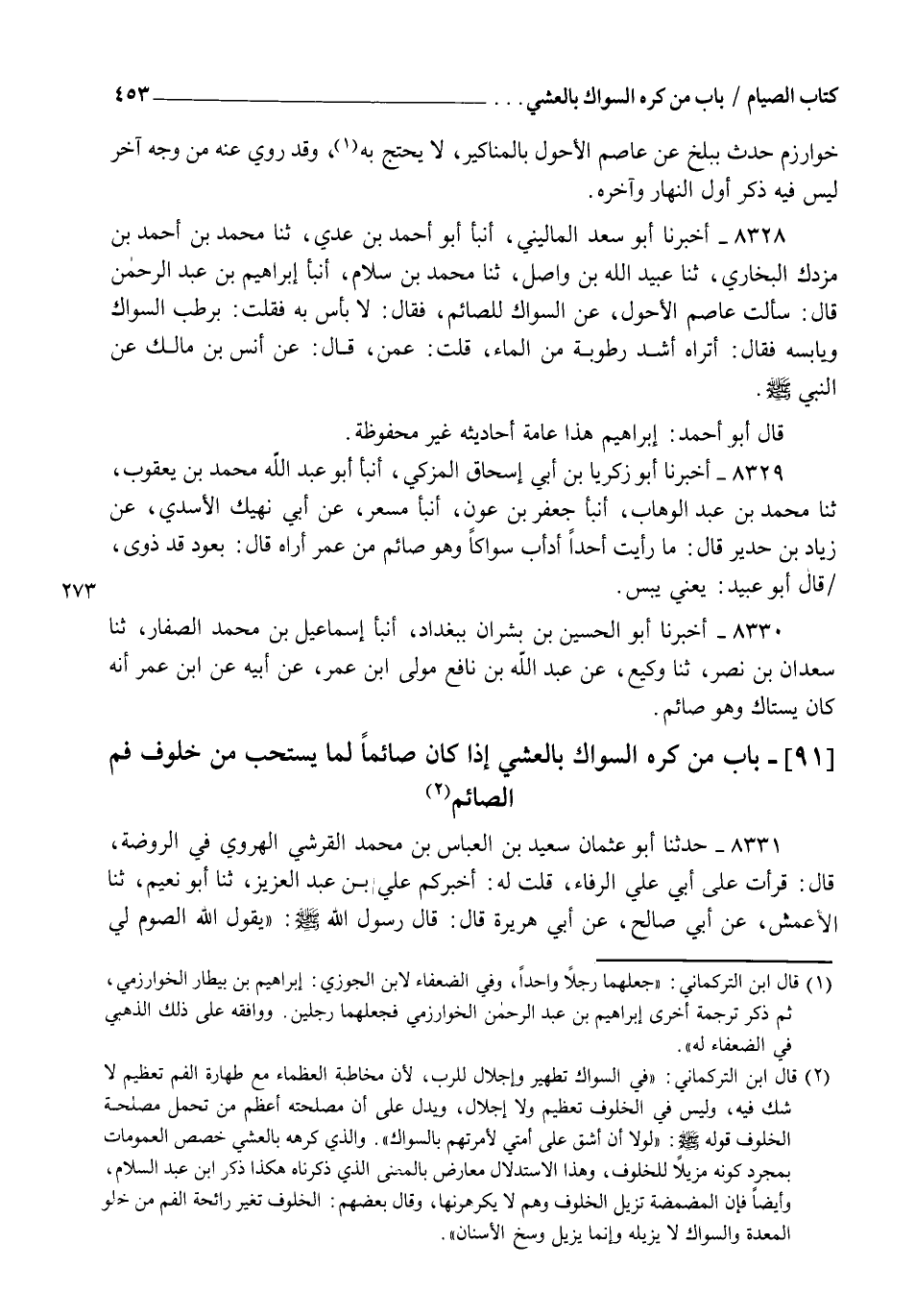 8328 - أَخْبَرَنَا أَبُو سَعْدٍ الْمَالِينِيُّ، أنبأ أَبُو أَحْمَدَ بْنُ عَدِيٍّ، ثنا مُحَمَّدُ بْنُ أَحْمَدَ بْنِ مَزْدَكٍ الْبُخَارِيُّ، ثنا عُبَيْدُ اللهِ بْنُ وَاصِلٍ، ثنا مُحَمَّدُ بْنُ سَلَّامٍ، أنبأ إِبْرَاهِيمُ بْنُ عَبْدِ الرَّحْمَنِ قَالَ: سَأَلْتُ عَاصِمَ الْأَحْوَلَ عَنِ §السِّوَاكِ لِلصَّائِمِ فَقَالَ: " لَا بَأْسَ بِهِ " , فَقُلْتُ بِرَطْبِ السِّوَاكِ وَيَابِسِهِ , فَقَالَ: " أَتُرَاهُ أَشَدَّ رُطُوبَةً مِنَ الْمَاءِ؟ " قُلْتُ عَمَّنْ , قَالَ " عَنْ أَنَسِ بْنِ مَالِكٍ عَنِ النَّبِيِّ صَلَّى اللهُ عَلَيْهِ وَسَلَّمَ " قَالَ أَبُو أَحْمَدَ: إِبْرَاهِيمُ هَذَا عَامَّةُ أَحَادِيثِهِ غَيْرُ مَحْفُوظَةٍ
