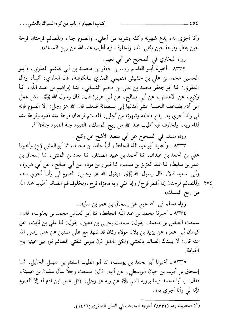 8333 - وَأَخْبَرَنَا أَبُو عَبْدِ اللهِ الْحَافِظُ، أنبأ حَامِدُ بْنُ مُحَمَّدٍ، ثنا أَبُو الْمُثَنَّى، ح وَأَخْبَرَنَا عَلِيُّ بْنُ أَحْمَدَ بْنِ عَبْدَانَ، ثنا أَحْمَدُ بْنُ عُبَيْدٍ الصَّفَّارُ، ثنا مُعَاذُ بْنُ الْمُثَنَّى، ثنا إِسْحَاقُ بْنُ عُمَرَ بْنِ سَلِيطٍ، ثنا عَبْدُ الْعَزِيزِ بْنُ مُسْلِمٍ، ثنا ضِرَارُ بْنُ مُرَّةَ، عَنْ أَبِي صَالِحٍ، عَنْ أَبِي هُرَيْرَةَ، وَأَبِي سَعِيدٍ قَالَا: قَالَ رَسُولُ اللهِ صَلَّى اللهُ عَلَيْهِ وَسَلَّمَ: " يَقُولُ اللهُ عَزَّ وَجَلَّ: §الصَّوْمُ لِي وَأَنَا أَجْزِي بِهِ وَلِلصَّائِمِ فَرْحَتَانِ إِذَا أَفْطَرَ فَرِحَ وَإِذَا لَقِيَ رَبَّهُ فَجَزَاهُ فَرِحَ , وَلَخُلُوفُ فَمِ الصَّائِمِ أَطْيَبُ عِنْدَ اللهِ مِنْ رِيحِ الْمِسْكِ " رَوَاهُ مُسْلِمٌ فِي الصَّحِيحِ عَنْ إِسْحَاقَ بْنِ عُمَرَ بْنِ سَلِيطٍ
