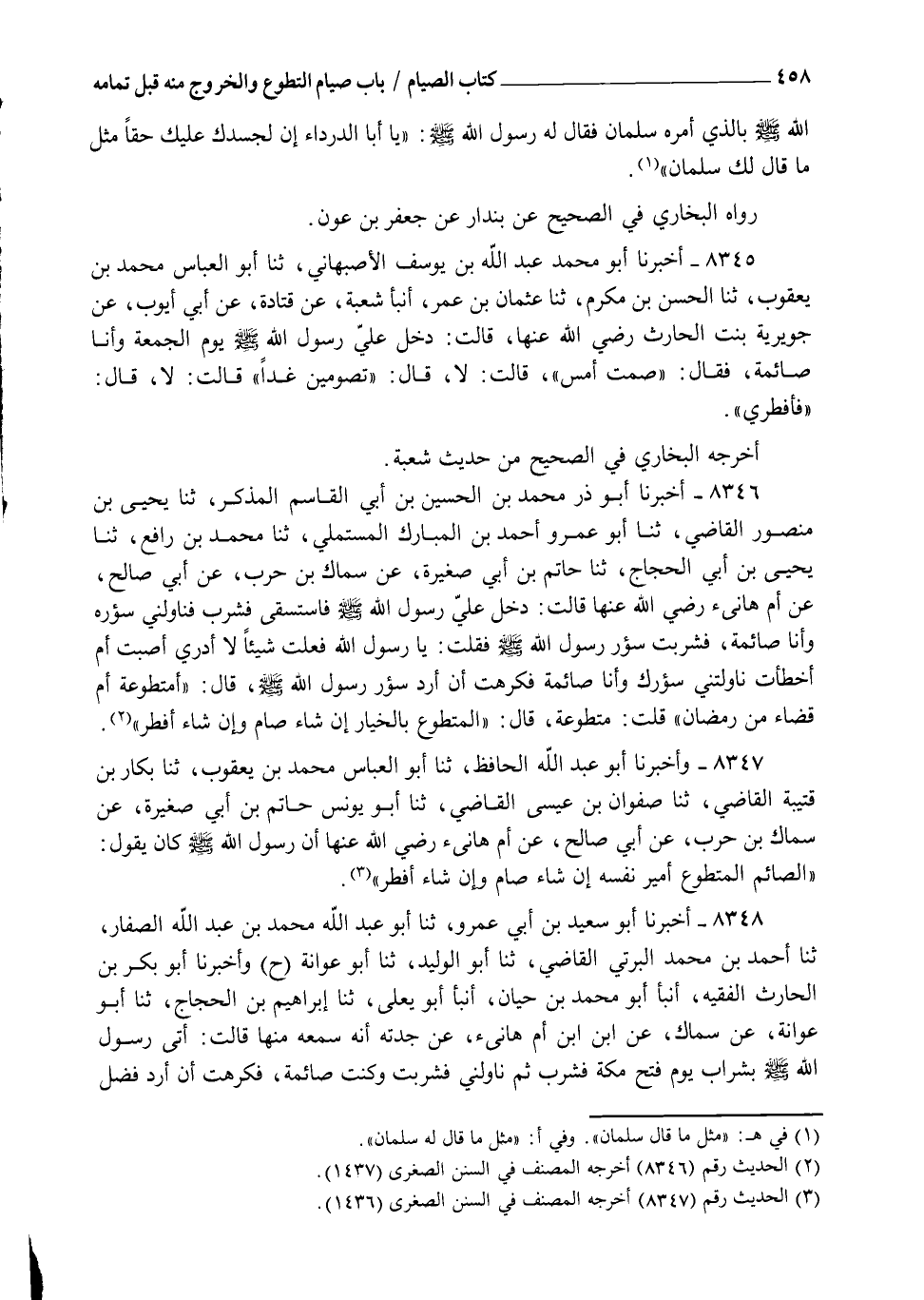 8346 - أَخْبَرَنَا أَبُو ذَرٍّ مُحَمَّدُ بْنُ الْحُسَيْنِ بْنِ أَبِي الْقَاسِمِ الْمُذَكِّرُ , ثنا يَحْيَى بْنُ مَنْصُورٍ الْقَاضِي، ثنا أَبُو عَمْرٍو أَحْمَدُ بْنُ الْمُبَارَكِ الْمُسْتَمْلِي , ثنا مُحَمَّدُ بْنُ رَافِعٍ، ثنا يَحْيَى بْنُ أَبِي الْحَجَّاجِ، ثنا حَاتِمُ بْنُ أَبِي صَغِيرَةَ، عَنْ سِمَاكِ بْنِ حَرْبٍ، عَنْ أَبِي صَالِحٍ، عَنْ أُمِّ هَانِئٍ رَضِيَ اللهُ عَنْهَا قَالَتْ: دَخَلَ عَلَيَّ رَسُولُ اللهِ صَلَّى اللهُ عَلَيْهِ وَسَلَّمَ فَاسْتَسْقَى فَشَرِبَ فَنَاوَلَنِي سُؤْرَهُ وَأَنَا صَائِمَةٌ فَشَرِبْتُ سُؤْرَ رَسُولِ اللهِ صَلَّى اللهُ عَلَيْهِ وَسَلَّمَ , فَقُلْتُ: يَا رَسُولَ اللهِ فَعَلْتُ شَيْئًا لَا أَدْرِي أَصَبْتُ أَمْ أَخْطَأْتُ نَاوَلْتَنِي سُؤْرَكَ وَأَنَا صَائِمَةٌ فَكَرِهْتُ أَنْ أَرُدَّ سُؤْرَ رَسُولِ اللهِ صَلَّى اللهُ عَلَيْهِ وَسَلَّمَ , قَالَ: " أَمُتَطَوِّعَةٌ أَمْ قَضَاءٌ مِنْ رَمَضَانَ؟ " قُلْتُ: مُتَطَوِّعَةٌ , قَالَ: §" الْمُتَطَوِّعُ بِالْخِيَارِ إِنْ شَاءَ صَامَ وَإِنْ شَاءَ أَفْطَرَ "