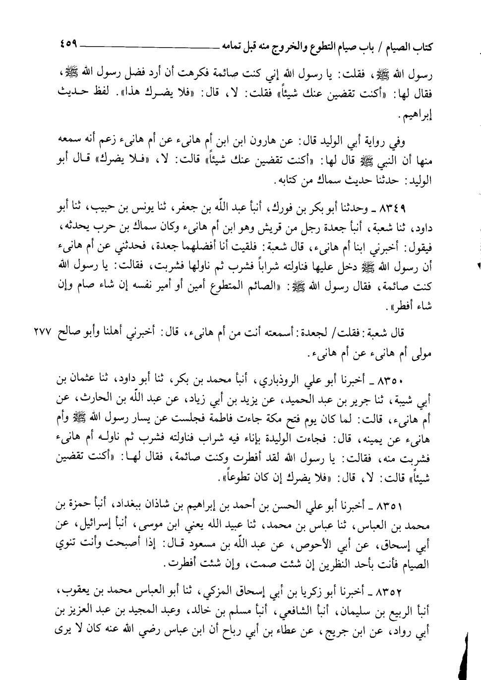 8349 - وَحَدَّثَنَا أَبُو بَكْرِ بْنُ فُورَكٍ، أنبأ عَبْدُ اللهِ بْنُ جَعْفَرٍ، ثنا يُونُسُ بْنُ حَبِيبٍ، ثنا أَبُو دَاوُدَ، ثنا شُعْبَةُ، أنبأ جَعْدَةُ رَجُلٌ مِنْ قُرَيْشٍ وَهُوَ ابْنُ أُمِّ هَانِئٍ وَكَانَ سِمَاكُ بْنُ حَرْبٍ يُحَدِّثُهُ فَيَقُولُ: أَخْبَرَنِي ابْنَا أُمِّ هَانِئٍ، قَالَ شُعْبَةُ: فَلَقِيتُ أَنَا أَفْضَلَهُمَا جَعْدَةَ فَحَدَّثَنِي عَنْ أُمِّ هَانِئٍ أَنَّ رَسُولَ اللهِ صَلَّى اللهُ عَلَيْهِ وَسَلَّمَ دَخَلَ عَلَيْهَا فَنَاوَلَتْهُ شَرَابًا فَشَرِبَ ثُمَّ نَاوَلَهَا فَشَرِبَتْ , فَقَالَتْ يَا رَسُولَ اللهِ: كُنْتُ صَائِمَةً , فَقَالَ رَسُولُ اللهِ صَلَّى اللهُ عَلَيْهِ وَسَلَّمَ: §" الصَّائِمُ الْمُتَطَوِّعُ أَمِينُ أَوْ أَمِيرُ نَفْسِهِ إِنْ شَاءَ صَامَ وَإِنْ شَاءَ أَفْطَرَ " قَالَ شُعْبَةُ فَقُلْتُ لِجَعْدَةَ أَسَمِعْتَهُ أَنْتَ مِنْ أُمِّ هَانِئٍ , قَالَ: أَخْبَرَنِي أَهْلُنَا وَأَبُو صَالِحٍ مَوْلَى أُمِّ هَانِئٍ عَنْ أُمِّ هَانِئٍ