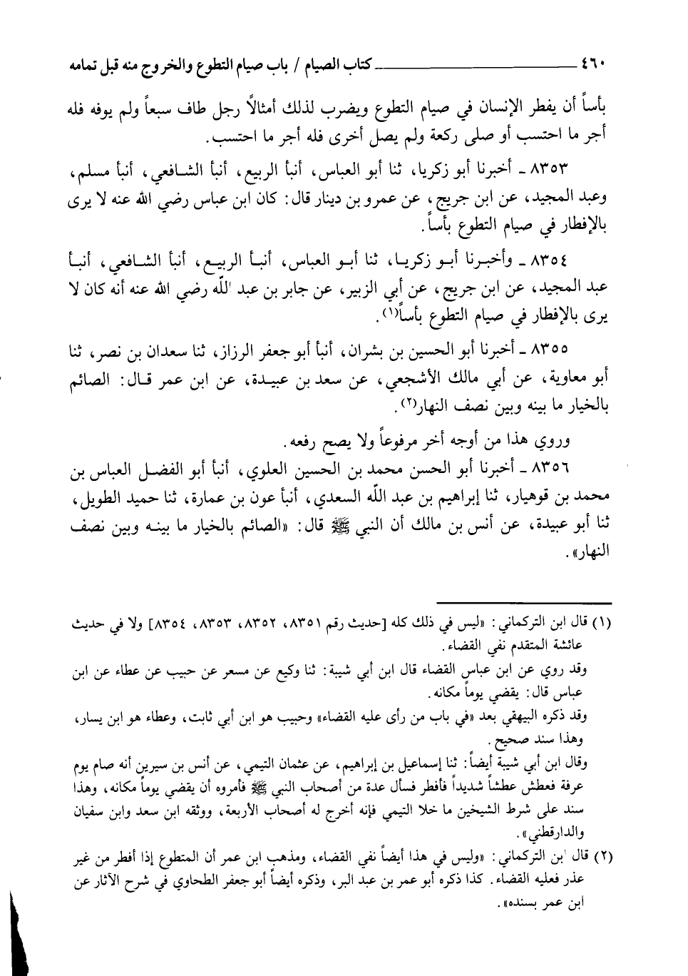 8353 - أَخْبَرَنَا أَبُو زَكَرِيَّا، ثنا أَبُو الْعَبَّاسِ، أنبأ الرَّبِيعُ، أنبأ الشَّافِعِيُّ، أنبأ مُسْلِمٌ، وَعَبْدُ الْمَجِيدِ، عَنِ ابْنِ جُرَيْجٍ، عَنْ عَمْرِو بْنِ دِينَارٍ قَالَ: كَانَ ابْنُ عَبَّاسٍ رَضِيَ اللهُ عَنْهُ §لَا يَرَى بِالْإِفْطَارِ فِي صِيَامِ التَّطَوُّعِ بَأْسًا
