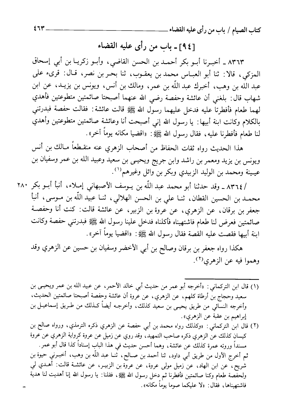 8363 - أَخْبَرَنَا أَبُو بَكْرٍ أَحْمَدُ بْنُ الْحَسَنِ الْقَاضِي , وَأَبُو زَكَرِيَّا بْنُ أَبِي إِسْحَاقَ الْمُزَكِّي , قَالَا: ثنا أَبُو الْعَبَّاسِ مُحَمَّدُ بْنُ يَعْقُوبَ , ثنا بَحْرُ بْنُ نَصْرٍ قَالَ: قُرِئَ عَلَى عَبْدِ اللهِ بْنِ وَهْبٍ أَخْبَرَكَ عَبْدُ اللهِ بْنُ عُمَرَ، وَمَالِكُ بْنُ أَنَسٍ، وَيُونُسُ بْنُ يَزِيدَ، عَنِ ابْنِ شِهَابٍ قَالَ: بَلَغَنِي أَنَّ عَائِشَةَ، وَحَفْصَةَ رَضِيَ اللهُ عَنْهُمَا أَصْبَحَتَا صَائِمَتَيْنِ مُتَطَوِّعَتَيْنِ فَأُهْدِيَ لَهُمَا طَعَامٌ فَأَفْطَرَتَا عَلَيْهِ فَدَخَلَ عَلَيْهِمَا النَّبِيُّ صَلَّى اللهُ عَلَيْهِ وَسَلَّمَ , قَالَتْ عَائِشَةُ: فَقَالَتْ حَفْصَةُ , فَبَدَرَتْنِي بِالْكَلَامِ وَكَانَتِ ابْنَةَ أَبِيهَا: يَا رَسُولَ اللهِ إِنِّي أَصْبَحْتُ أَنَا وَعَائِشَةُ صَائِمَتَيْنِ مُتَطَوِّعَتَيْنِ وَأُهْدِيَ لَنَا طَعَامٌ فَأَفْطَرْنَا عَلَيْهِ , فَقَالَ رَسُولُ اللهِ صَلَّى اللهُ عَلَيْهِ وَسَلَّمَ: §" اقْضِيَا مَكَانَهُ يَوْمًا آخَرَ ". هَذَا الْحَدِيثُ رَوَاهُ ثِقَاتُ الْحُفَّاظِ مِنْ أَصْحَابِ الزُّهْرِيِّ عَنْهُ مُنْقَطِعًا مَالِكُ بْنُ أَنَسٍ وَيُونُسُ بْنُ يَزِيدَ وَمَعْمَرُ بْنُ رَاشِدٍ وَابْنُ جُرَيْجٍ وَيَحْيَى بْنُ سَعِيدٍ وَعُبَيْدُ اللهِ بْنُ عُمَرَ وَسُفْيَانُ بْنُ عُيَيْنَةَ وَمُحَمَّدُ بْنُ الْوَلِيدِ الزُّبَيْدِيُّ وَبَكْرُ بْنُ وَائِلٍ وَغَيْرُهُمْ
