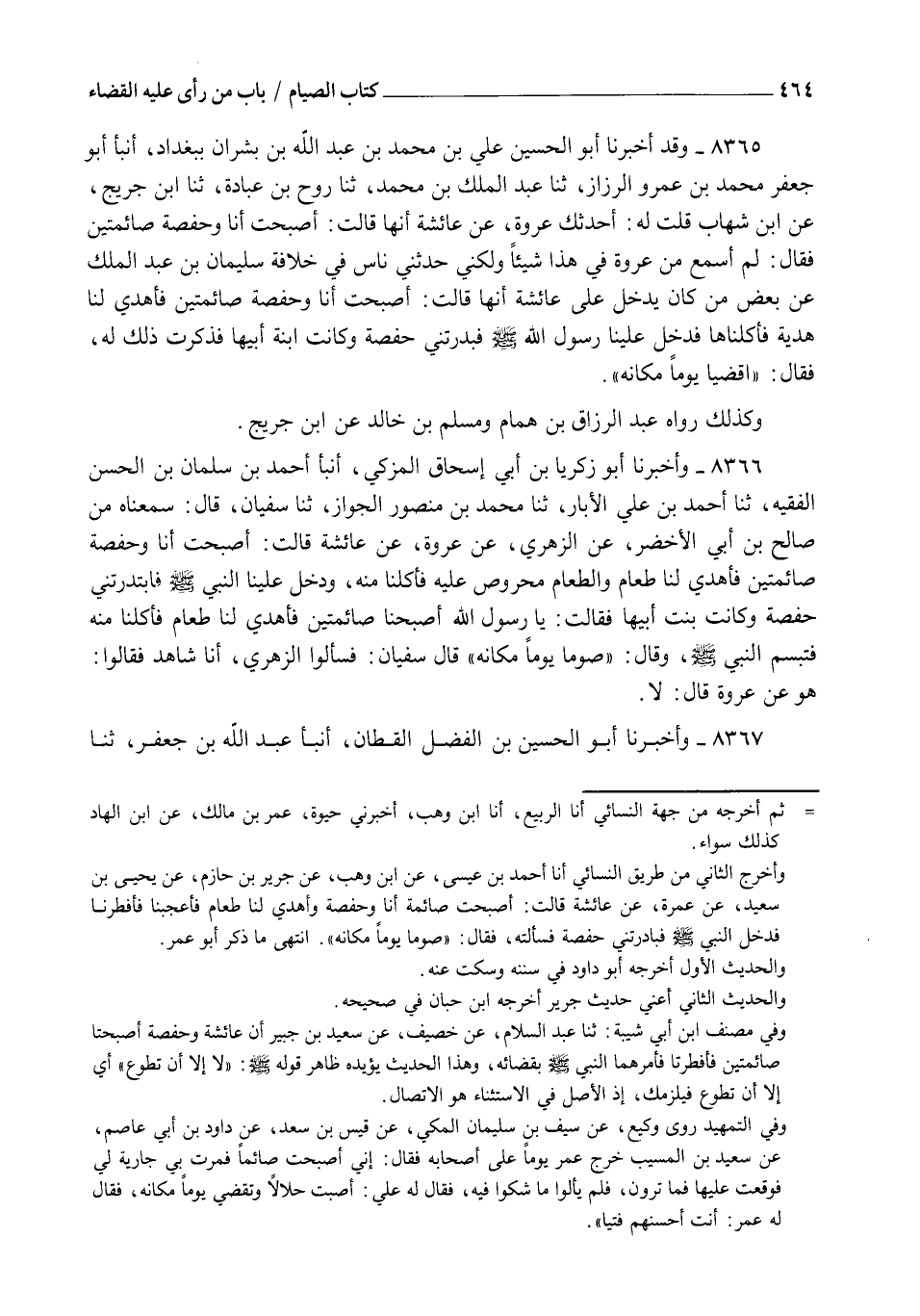 8365 - وَقَدْ أَخْبَرَنَا أَبُو الْحُسَيْنِ عَلِيُّ بْنُ مُحَمَّدِ بْنِ عَبْدِ اللهِ بْنِ بِشْرَانَ بِبَغْدَادَ , أنبأ أَبُو جَعْفَرٍ مُحَمَّدُ بْنُ عَمْرٍو الرَّزَّازُ ثنا عَبْدُ الْمَلِكِ بْنُ مُحَمَّدٍ، ثنا رَوْحُ بْنُ عُبَادَةَ، ثنا ابْنُ جُرَيْجٍ، عَنِ ابْنِ شِهَابٍ، قُلْتُ لَهُ: أَحَدَّثَكَ عُرْوَةُ , عَنْ عَائِشَةَ، أَنَّهَا قَالَتْ: أَصْبَحْتُ أَنَا وَحَفْصَةُ صَائِمَتَيْنِ , فَقَالَ: لَمْ أَسْمَعْ مِنْ عُرْوَةَ فِي هَذَا شَيْئًا وَلَكِنِّي حَدَّثَنِي نَاسٌ فِي خِلَافَةِ سُلَيْمَانَ بْنِ عَبْدِ الْمَلِكِ عَنْ بَعْضِ مَنْ كَانَ يَدْخُلُ عَلَى عَائِشَةَ أَنَّهَا قَالَتْ: أَصْبَحْتُ أَنَا وَحَفْصَةُ صَائِمَتَيْنِ فَأُهْدِيَ لَنَا هَدِيَّةٌ فَأَكَلْنَاهَا فَدَخَلَ عَلَيْنَا رَسُولُ اللهِ صَلَّى اللهُ عَلَيْهِ وَسَلَّمَ فَبَدَرَتْنِي حَفْصَةُ وَكَانَتِ ابْنَةَ أَبِيهَا , فَذَكَرَتْ ذَلِكَ لَهُ فَقَالَ: §" اقْضِيَا يَوْمًا مَكَانَهُ " وَكَذَلِكَ رَوَاهُ عَبْدُ الرَّزَّاقِ بْنُ هَمَّامٍ وَمُسْلِمُ بْنُ خَالِدٍ عَنِ ابْنِ جُرَيْجٍ