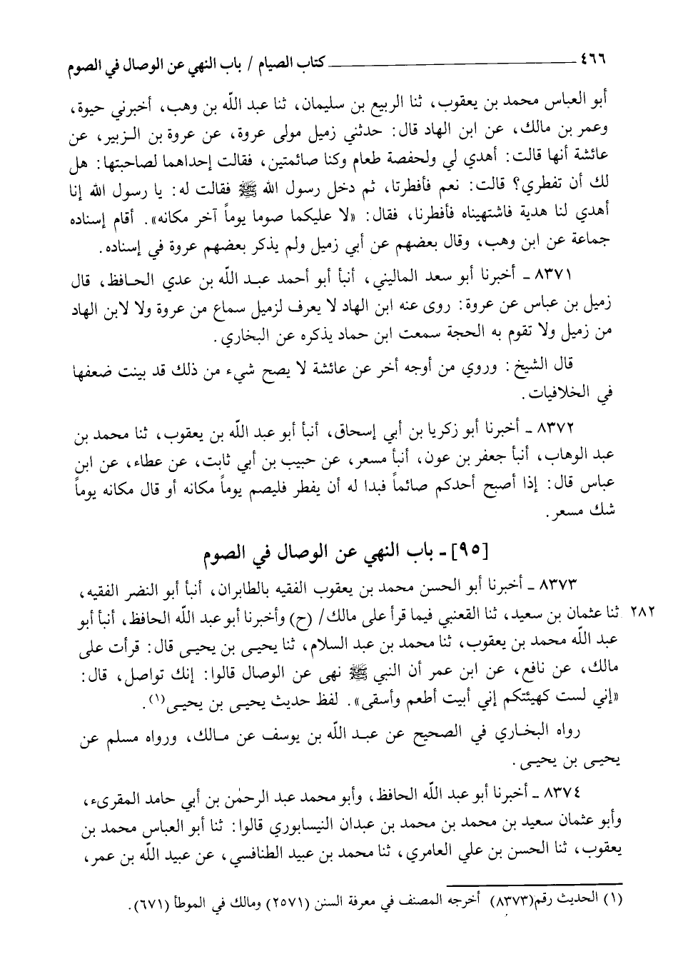 8373 - أَخْبَرَنَا أَبُو الْحَسَنِ مُحَمَّدُ بْنُ يَعْقُوبَ الْفَقِيهُ بِالطَّابِرَانِ أنبأ أَبُو النَّضْرِ الْفَقِيهُ، ثنا عُثْمَانُ بْنُ سَعِيدٍ، ثنا الْقَعْنَبِيُّ، فِيمَا قَرَأَ عَلَى مَالِكٍ ح وَأَخْبَرَنَا أَبُو عَبْدِ اللهِ الْحَافِظُ، أنبأ أَبُو عَبْدِ اللهِ مُحَمَّدُ بْنُ يَعْقُوبَ , ثنا مُحَمَّدُ بْنُ عَبْدِ السَّلَامِ، ثنا يَحْيَى بْنُ يَحْيَى، قَالَ: قَرَأْتُ عَلَى مَالِكٍ عَنْ نَافِعٍ، عَنِ ابْنِ عُمَرَ أَنَّ النَّبِيَّ صَلَّى اللهُ عَلَيْهِ وَسَلَّمَ نَهَى عَنِ الْوِصَالِ قَالُوا: إِنَّكَ تُوَاصِلُ، قَالَ: §" إِنِّي لَسْتُ كَهَيْئَتِكُمْ إِنِّي أَبِيتُ أُطْعَمُ وَأُسْقَى " لَفْظُ حَدِيثِ يَحْيَى بْنِ يَحْيَى رَوَاهُ الْبُخَارِيُّ فِي الصَّحِيحِ عَنْ عَبْدِ اللهِ بْنِ يُوسُفَ عَنْ مَالِكٍ وَرَوَاهُ مُسْلِمٌ عَنْ يَحْيَى بْنِ يَحْيَى
